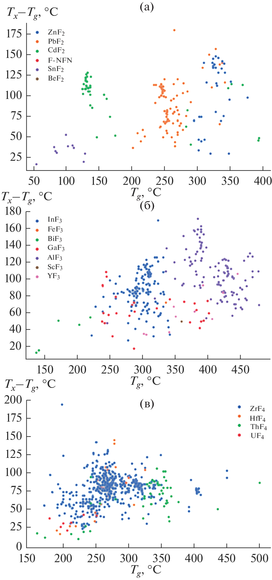 Using content analysis and the Python programming environment, we have found a number of general relationships determining the thermal properties of fluoride and modified fluoride glasses. Their compositions have been classified according to their glass transition temperature (Tg) and the difference between their crystallization onset temperature (Tx) and glass transition temperature: Tx – Tg. The use of Kauzmann’s rule for fluoride glasses, unmodified and modified with other halogens, has been shown to be more reliable if the Tg/Tm ratio is used, compared to the Tg/Tl ratio. We have qualitatively assessed how anion modification influences characteristic temperatures (glass transition temperature Tg, crystallization onset temperature Tx, crystallization peak temperature Tc, melting onset temperature Tm, and liquidus temperature Tl) and crystallization stability criteria (Hruby criterion K, Saad–Poulain criterion S, reduced thermal stability interval H, thermal stability interval Tx – Tg, and reduced glass transition temperatures Tg/Tm and Tg/Tl).