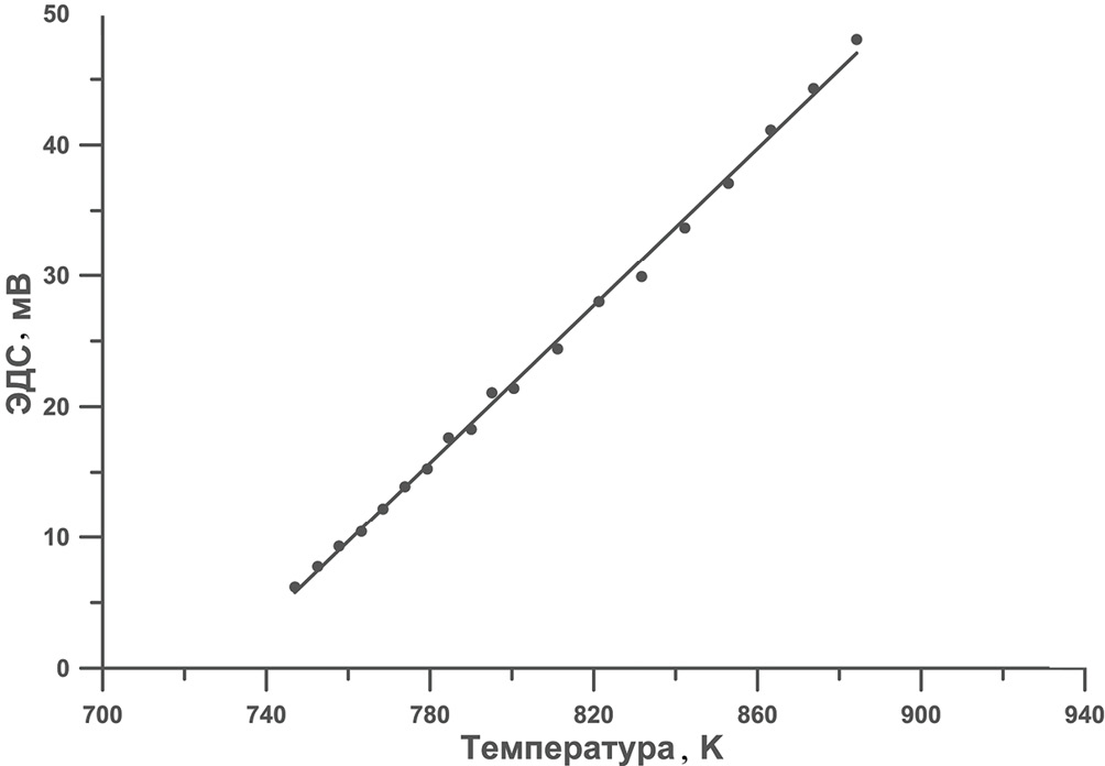 Процесс измерений. ЭДС измеряли методом “температурного титрования”, т.е. на каждой температурной ступеньке ожидалось постоянное (равновесное) значение ЭДС. Такая процедура использовалась для контроля точности и воспроизводимости получаемых данных E(T). Обычно начальная температура устанавливалась в середине измеряемого диапазона, в данном случае она составила порядка 800 K. После достижения равновесного значения ЭДС температура плавно понижалась с шагом 10 K до минимальной, затем повышалась на 5 K и далее на 10 K до максимальной температуры. В результате все точки E(T) получены с температурным интервалом 5–10 K, а также со значительным временным интервалом между соседними точками, что подтверждает воспроизводимость результатов в процессе всего опыта.