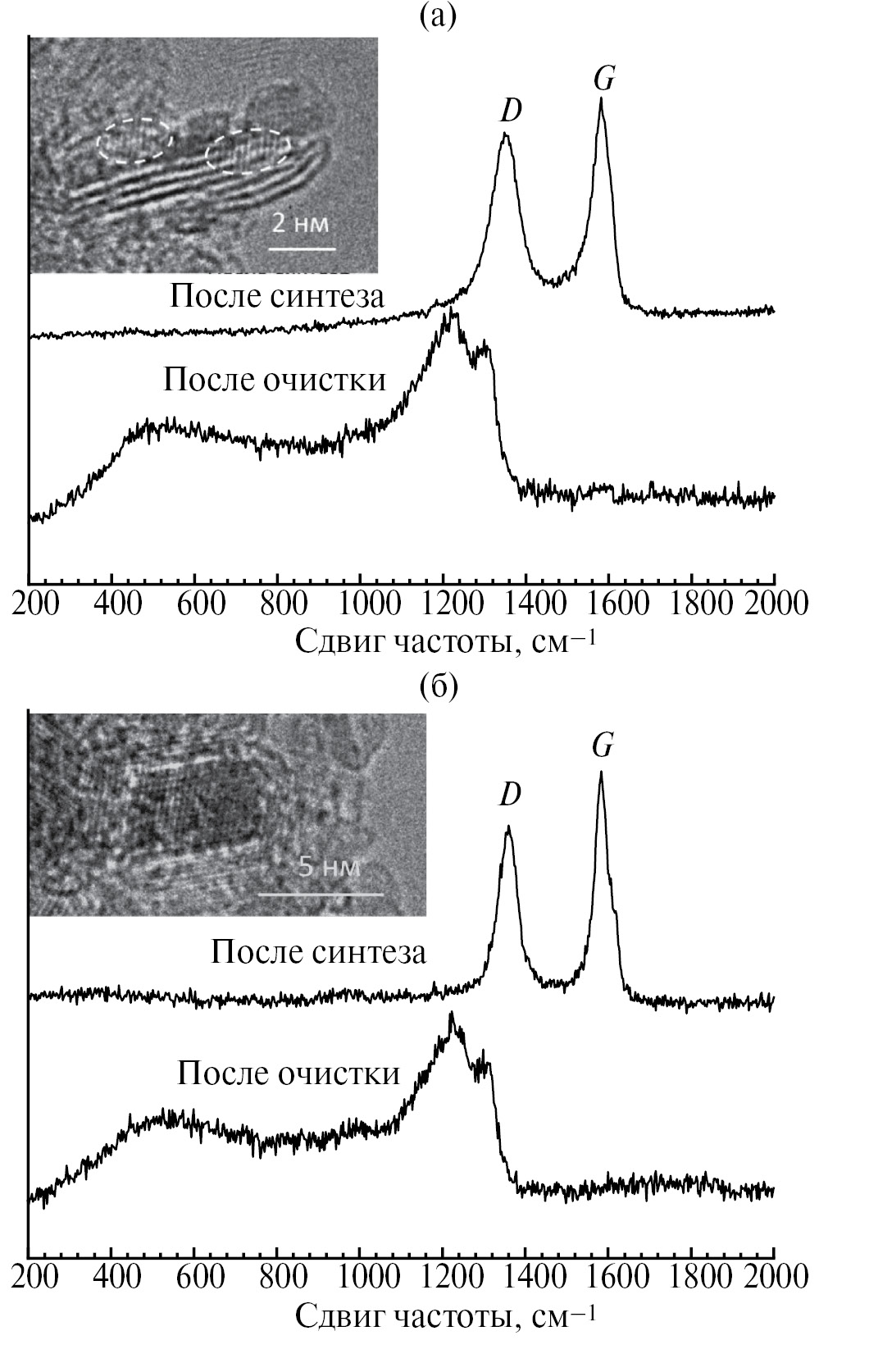 Рис. 5. Спектры КРС образцов, синтезированных при 1270 (а) и 1520 K (б) до и после очистки; на вставках ПЭМ-изображения микроструктуры образцов после синтеза.