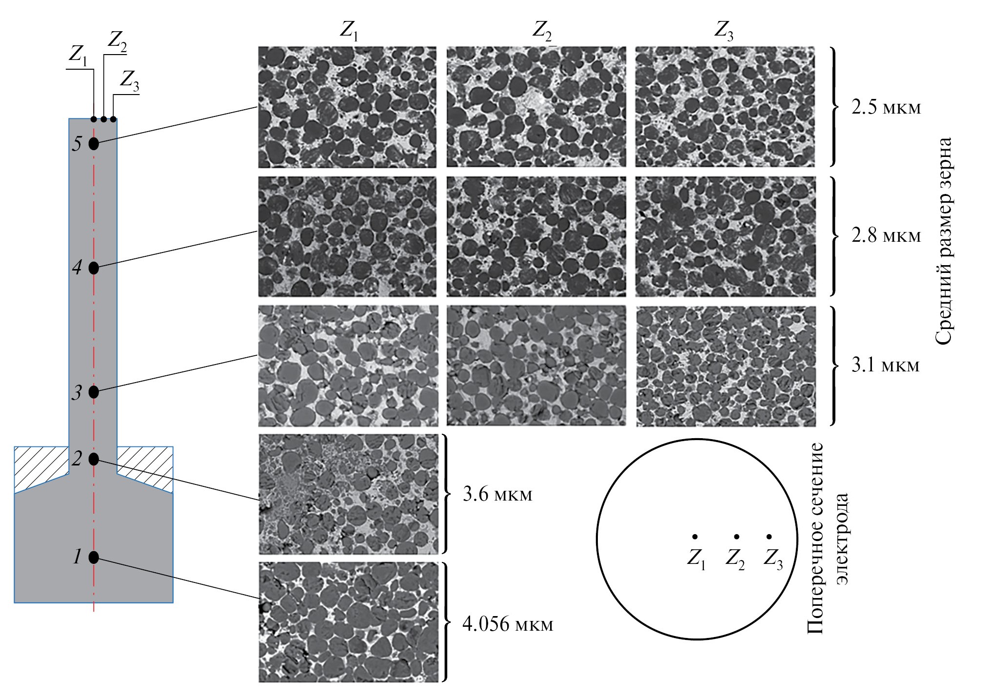 Для установления среднего размера зерна TiC по радиусу экструдированного стержня (табл. 1) были выбраны три зоны: Z1, Z2, Z3 (рис. 3). Зона 1 характеризуется как центр экструдированного стержня.