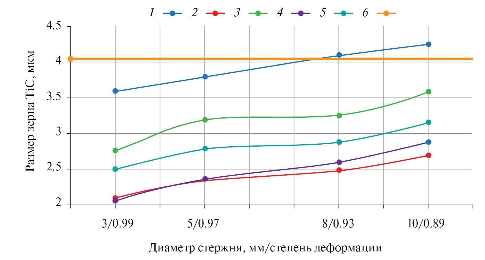 Таким образом, установлено, что средний размер карбидного зерна TiC по длине экструдированного стержня изменяется от 2.5 до 3.6 мкм. При этом максимальный размер зерна наблюдается в области 2. По мере удаления от формующей зоны, на расстоянии более 30 мм, средний размер зерна практически не изменяется и находится в диапазоне 2.5–2.8 мкм. Для областей 3–5 средний размер зерна уменьшается примерно в 1.3 раза.