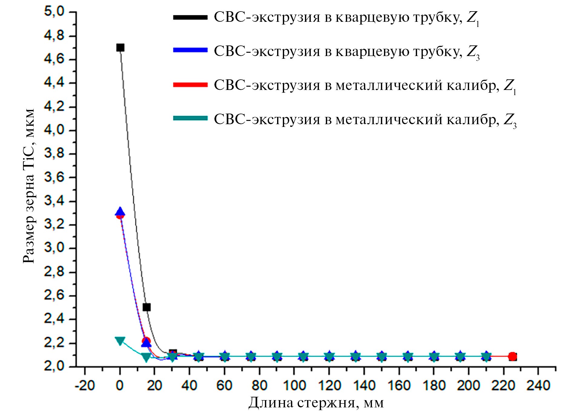 Математическая модель и результаты проведенных экспериментов показали, что на размер зерна влияют также условия теплоотвода. При экструдировании в металлический калибр диаметром 3 мм размер зерен TiC снижается от 3.3 до 2.1 мкм по сравнению с экструдированием в кварцевую трубку, где размер зерен уменьшается с 4.7 до 2.1 мкм.