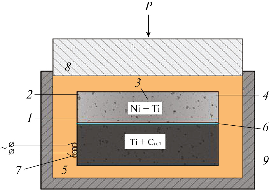 Предварительное прессование в пресс-формах диаметром 70 и 30 мм для смеси Ti+Ni проводили под давлением 250 МПа до относительной плотности 0.6–0.63, а для смеси Ti+C0.7 – под давлением 20 МПа до относительной плотности 0.55. Масса прессованных образцов из смеси Ti+Ni диаметром 70 мм составляла 150 г, диаметром 30 мм – 30 г. Плотные образцы из никелида титана с использованием ХП получали методом СВС-компактирования в «песчаной» пресс-форме с внутренним диаметром 105 мм по схеме, представленной на рис. 1. Горячий продукт синтеза уплотняли с помощью гидравлического пресса с максимальным усилием 160 тс. Давление прессования 100 МПа прикладывали к образцу после завершения горения прессовок Ni+Ti с выдержкой 20 с.