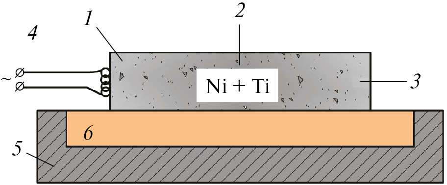 Рис. 3. Схема измерения параметров горения образцов из МА-смеси Ni+Ti на воздухе: 1–3 – термопары, 4 – инициирующая спираль, 5 – стальная матрица, 6 – теплоизолятор из SiO2.