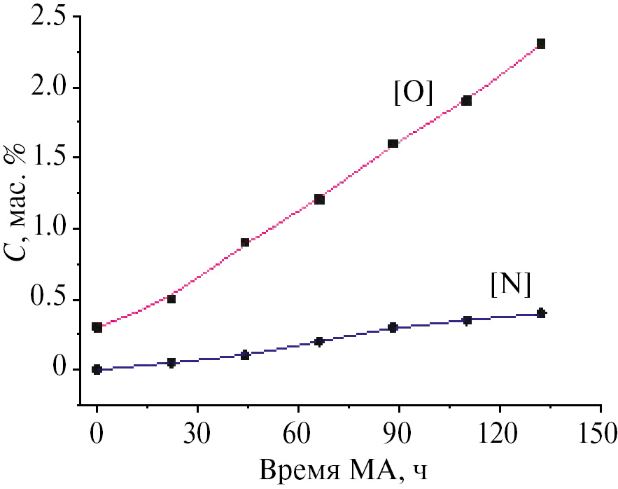 В процессе МА порошковых смесей 3 и 4 из барабана шаровой мельницы брали пробы для определения содержания кислорода и азота. На рис. 4 представлены зависимости содержания кислорода и азота в смеси Ni+Ti от времени ее обработки (МА). Видно, что в процессе МА в течение 130 ч концентрация кислорода увеличивается с 0.3 до 2.3%, при этом содержание азота изменяется незначительно.