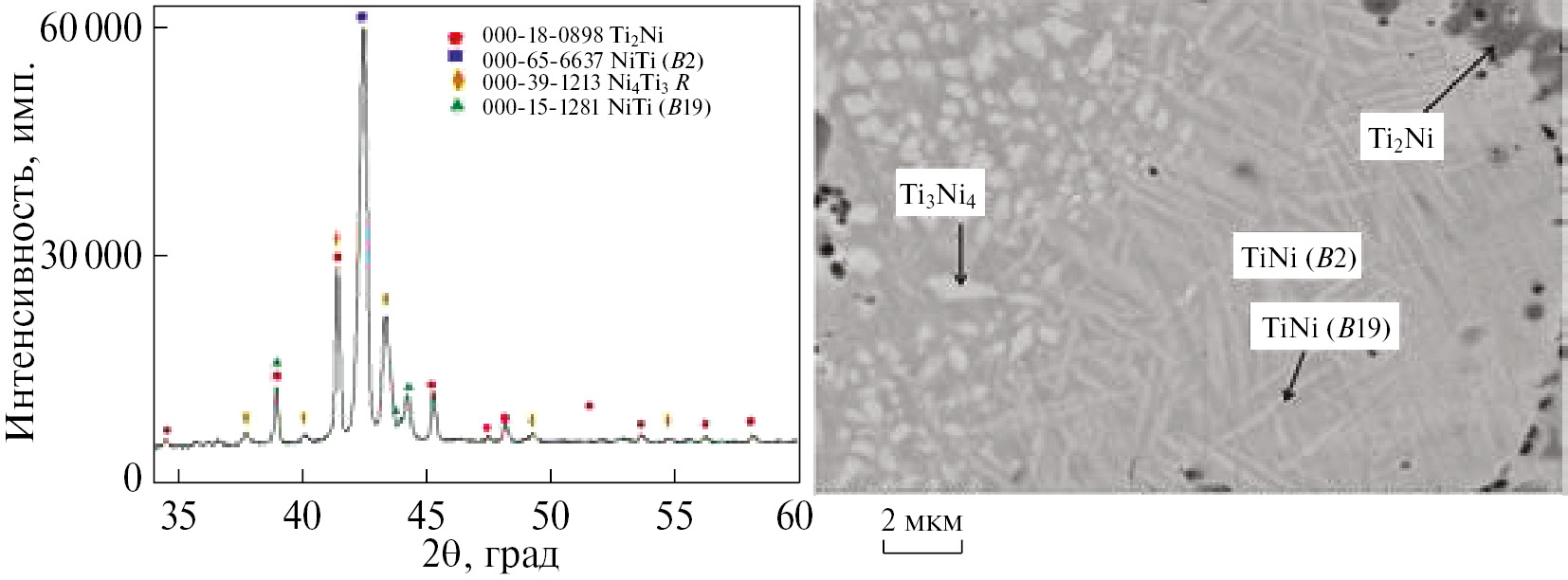 На рис. 6–12 представлены дифрактограммы и микрофотографии сплавов 1–7. Полученные данные указывают на формирование многофазных сплавов, содержащих интерметаллиды системы Ni–Ti (табл. 3). Несмотря на заложенный эквимолярный состав смеси Ni+Ti, времени нахождения образца при температуре, необходимой для протекания процессов диффузии и гомогенизации, недостаточно для формирования равновесного состава сплава. На рис. 6 представлены дифрактограмма и микроструктура сплава 1. Основной фазой, по данным РФА, является NiTi (~44.5 об.%, табл. 3). Также присутствуют Ti2Ni и Ni4Ti3. Наличие фазы NiTi (B19) иглообразной формы указывает на мартенситный переход фазы NiTi(В2) в NiTi(B19). При снижении температуры горения до 1250°С в сплаве 2, полученном с использованием ХМ меньшей массы, интенсивность рефлексов Ti2Ni увеличивается, а NiTi уменьшается (38 об.%, табл. 3) . В сплаве присутствуют крупные зерна фазы Ti2Ni (рис. 7).