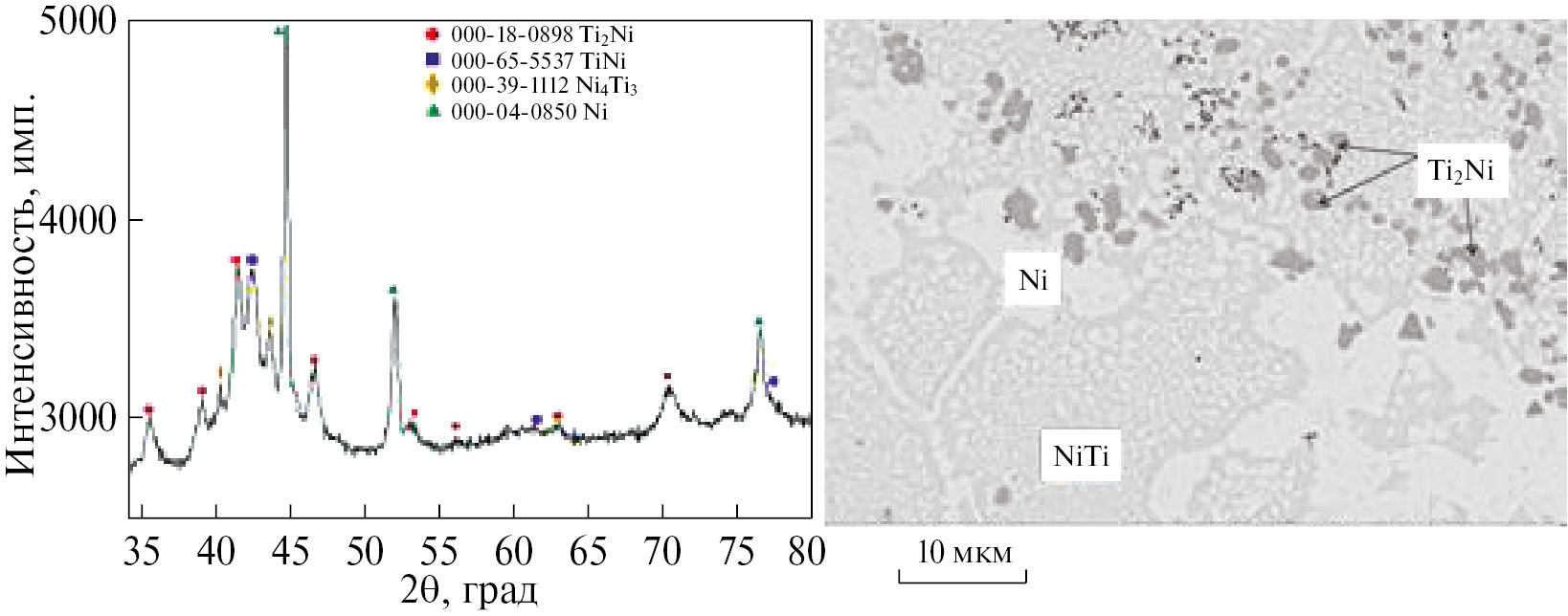 Микроструктура сплава 5, полученного с использованием Ti c повышенным содержанием водорода (0.6 об.%, табл. 1), отличается наличием областей с непрореагировавшим Ni. Максимальный пик на дифрактограмме принадлежит Ni (рис. 10).