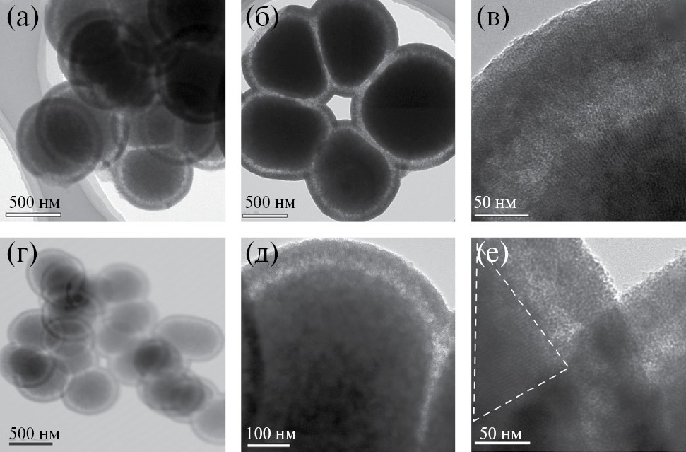 Время, через которое в смеси при t = –20°С появляются частицы, на два порядка больше времени их возникновения при 50°С (табл. 1). По-видимому, процесс роста частиц лимитирован скоростью гидролиза ТЭОС, экспоненциально зависящей от температуры. Длинные мицеллы ЦТАБ и кластеры плотноупакованных мицелл ЦТАБ достаточно медленно (в течение часа) покрываются продуктами гидролиза ТЭОС. Находясь при столь низкой температуре, реакционная смесь становится более агрегативно устойчива, и коагуляция кластеров происходит значительно медленнее по сравнению с вышеописанными синтезами. В результате формируются частицы, состоящие из кластеров SiO₂/ЦТАБ размером до 100 нм. Типичный крупный кластер плотноупакованных наноканалов SiO₂ выделен белым треугольником (рис. 6е). На ПЭМ- изображениях видно, что некоторые частицы имеют несферическую форму (рис. 6), вероятно, их ядро состоит из нескольких крупных несферических кластеров. Покрытие образовавшихся частиц оболочкой, по-видимому, осуществляется так же, как в случае температур синтеза 10 и 30°С. Частицы, синтезированные при 0°С, вероятно, имеют схожий механизм формирования с частицами, полученными при t = ‒20°С, поскольку их морфология идентична (рис.6).