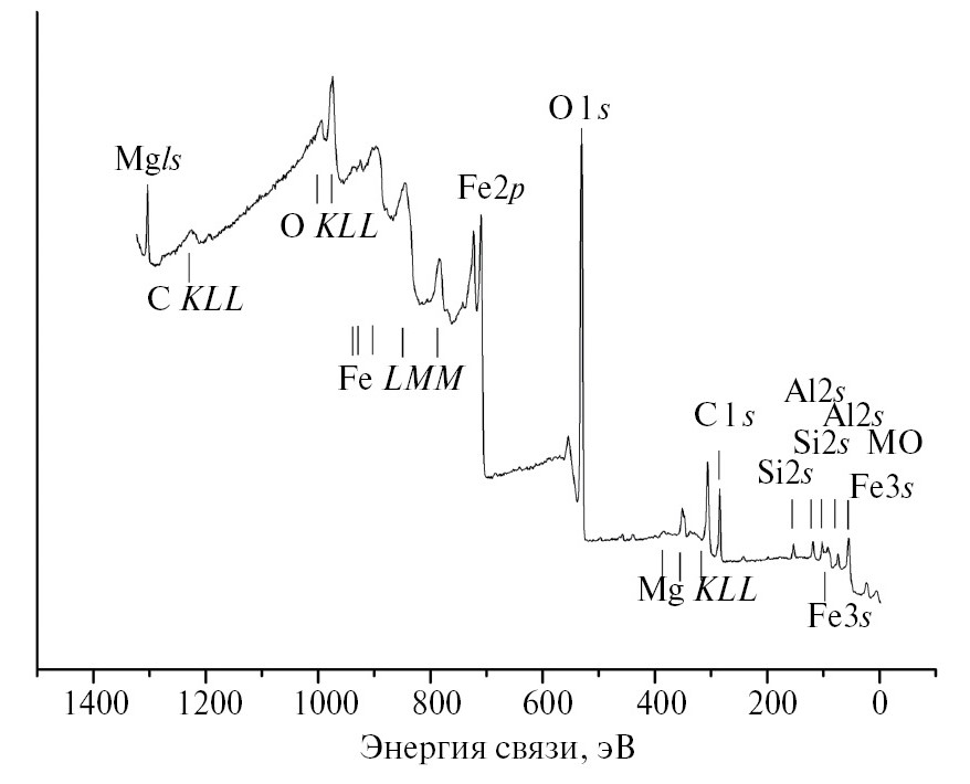 Количественный элементный анализ проведен для поверхностных слоев исследуемого образца толщиной в несколько нанометров (~5 нм [13]). Использовалось следующее соотношение: ni/nj = (Si/Sj) (kj/ki), где ni/nj – относительная концентрация исследуемых атомов, Si/Sj – относительная интенсивность (площадь) спектров остовных электронов, kj/ki – относительный фактор экспериментальной чувствительности. Были использованы следующие факторы чувствительности относительно C 1s: 1.00 (C 1s), 2.81 (O 1s), 10.64 (Fe 2p), 0.80 (Fe 3s), 1.33 (Fe 3p), 1.18 (Si 2p), 0.69 (Al 2p), 0.91 (Mg 2s), 1.33 (Ti 3p). Эти факторы чувствительности входят в программное обеспечение спектрометра.