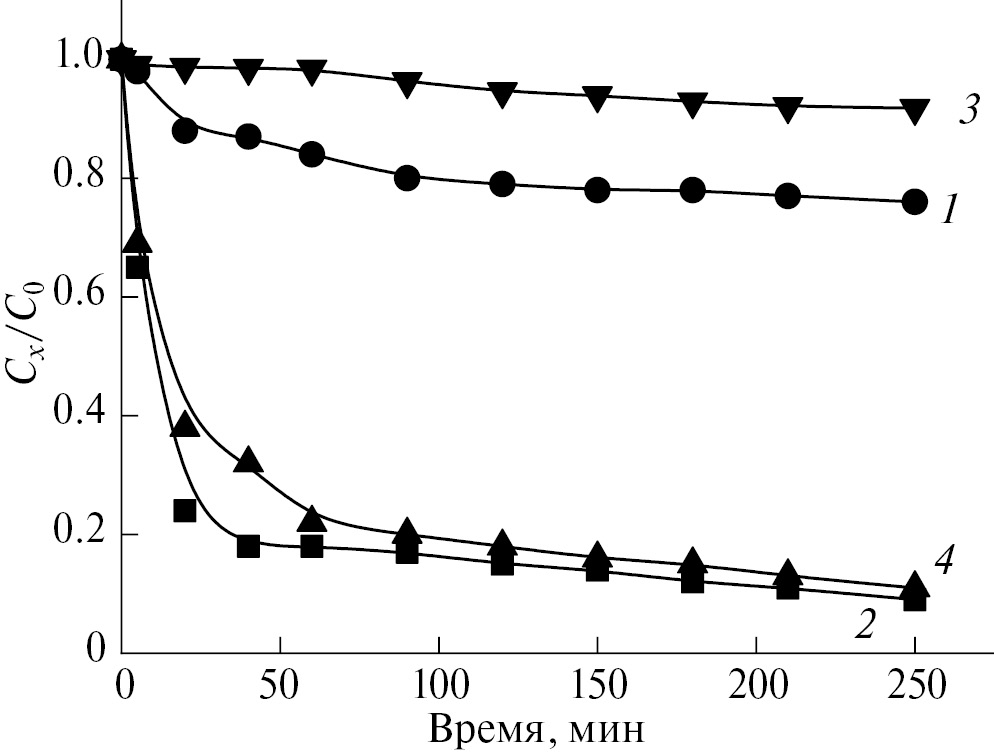 Рис. 2. Фотокаталитическая активность ткани с покрытиями на основе TiO2: 1 – нанесенным магнетронным напылением; 2 – полученным золь–гель-синтезом; 3 – нанесенным магнетронным напылением и подвергнутым трению; 4 – полученным золь–гель-синтезом и подвергнутым трению.