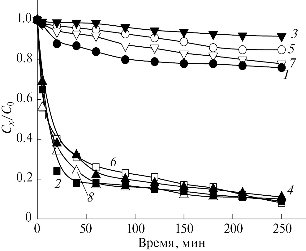 Рис. 3. Фотокаталитическая активность ткани с покрытиями на основе: 1 – TiO2, нанесенным магнетронным напылением; 2 – TiO2, полученным золь–гель-синтезом; 3 – TiO2, нанесенным магнетронным напылением и подвергнутым трению; 4 – TiO2, полученным золь–гель-синтезом и подвергнутым трению; 5 – TiO2 и Ag, нанесенным магнетронным напылением; 6 – TiO2 и Ag, полученным золь–гель-синтезом; 7 – TiO2 и Ag, нанесенным магнетронным напылением и подвергнутым трению; 8 – TiO2 и Ag, полученным золь-гель-синтезом и подвергнутым трению.