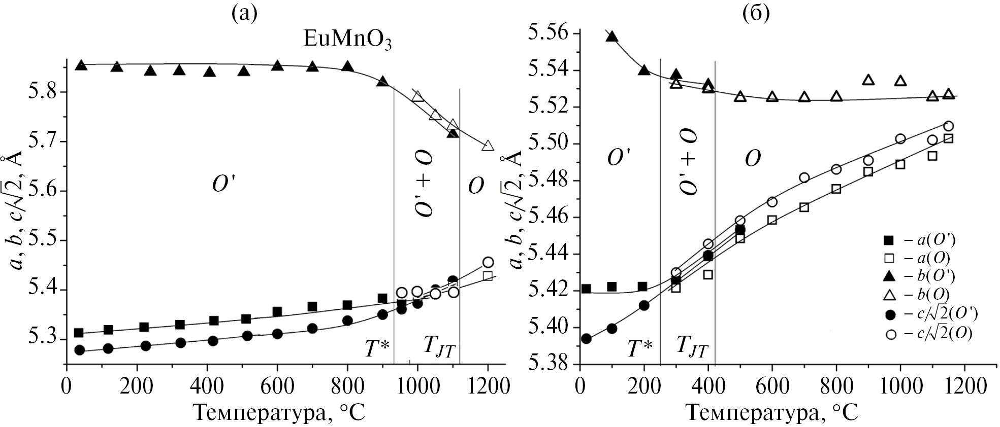 Переход Я-Т в манганитах европия был подтвержден с помощью высокотемпературной рентгеновской дифракции (рис. 3). Температурные зависимости параметров элементарной ячейки манганитов демонстрируют уменьшение параметра b и увеличение параметров а и c. Значения параметров a и c/√2 сходятся (рис. 3) в области перехода Я-Т. Выше этой температуры соотношение параметров элементарной ячейки становится a < c/√2 < b, что указывает на переход из упорядоченной фазы в неупорядоченную (O’→О). Это фазовый переход первого рода, поэтому существует двухфазная область (рис. 3). Кооперативное Я-Т-искажение устраняет вырождение орбитали Mn3+ ниже температуры перехода TJT, а ниже температуры T* существует дальний порядок орбиталей 3d3x2-r2 и 3d3y2- r2 [17].