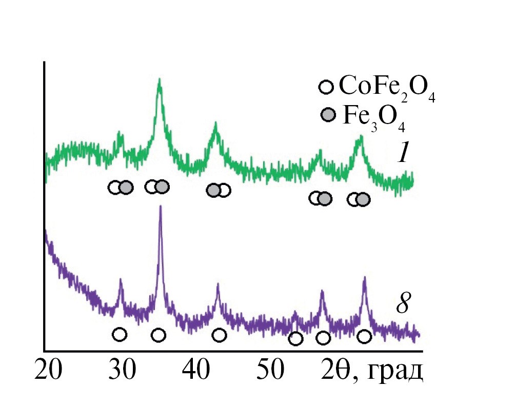 На рис. 1 в качестве примера приведены рентгенограммы образцов 1 и 8. На рентгенограммах зафиксирована фаза кубического феррита кобальта(II) (PDF Number 000-03-0864). Образец 1 неоднофазен: установлено присутствие Fe₃O₄ (PDF Number 010-71-6337). Биочары рентгеноаморфны.