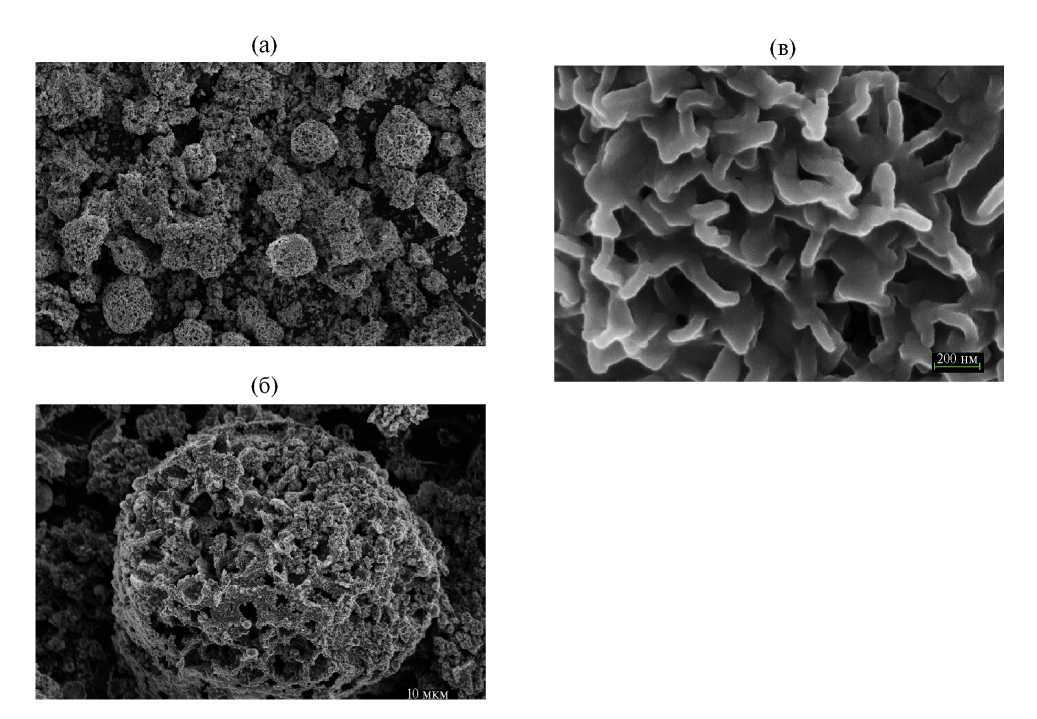 Полученный в результате гальванического замещения осадок представляет собой мелкокристаллический порошок (рис. 2), состоящий из частиц с размерами 50–100 мкм. Частицы синтезированного дисперсного образца системы Fe–Ni–Co–Cu характеризуются как сфероподобные микроразмерные каркасные структуры (рис. 2б) с большим количеством зародышей размером порядка 50–60 нм (рис. 2в).