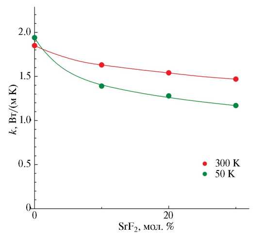 На рис. 4 можно проследить следующие закономерности. Видно, что теплопроводность снижается в ряду образцов с составами 80–00–20, 70–10–20, 60–20–20, 50–30–20 при увеличении доли стронция за счет соответствующего снижения доли кальция. Для двух крайних температур (Т=50 и 300 К) этот эффект представлен на рис. 5 в виде концентрационных зависимостей теплопроводности k(x). Видно, что эти зависимости слабые, но четко выраженные монотонно убывающие. Напомним, что в случае изовалентного твердого раствора Ca1-xSrxF2 в области содержания второго компонента от 0 до 30 мол. % наблюдается убывающая концентрационная зависимость теплопроводности [13].