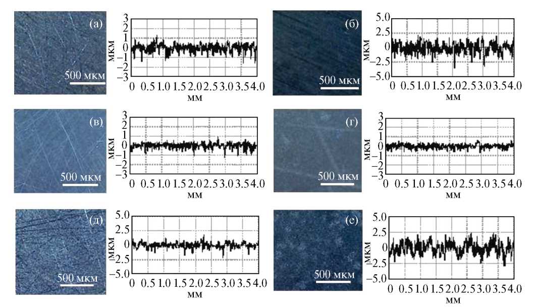 Морфология поверхности подложек. Морфология поверхности исследуемых образцов контролировалась с помощью цифрового USB-микроскопа Micmed 2.0 и измерителя шероховатости TIME 3220. В работе были использованы подложки со средним значением шероховатости Ra 0.3–0.7 мкм. Микрофотографии и профилограммы поверхности образцов приведены на рис. 1.