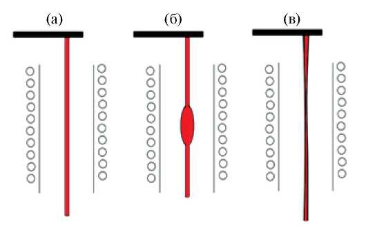 Рис. 3. Схема процесса измерения поверхностного натяжения. а – начальный момент, б – преобладание силы поверхностного натяжения, в – преобладание силы тяжести.
