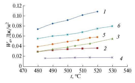 Рис. 6. Температурные зависимости работы адгезии расплава стекла Ge28Sb12Se60 к исследуемым материалам. 1 – сталь AISI 201, 2 – сталь AISI 201 с азотированной поверхностью, 3 – сталь AISI 430, 4 – сталь AISI 430 с азотированной поверхностью, 5 – титан, 6 – сплав ВК8.