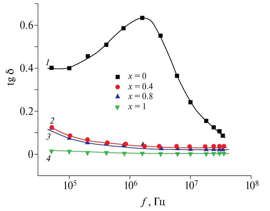 Частотные зависимости тангенса угла диэлектрических потерь (tgδ) твердых растворов (TlGaSe2)1–x(TlGaS2)x показаны на рис. 6. В монокристалле TlGaSe2 зависимость tgδ(f) проходила через максимум при частоте f = 1.6 × 106 Гц с дальнейшим резким спадом (рис. 6, кривая 1). Наличие максимума на кривой tgδ(f) свидетельствует о релаксационных потерях [43] в монокристалле TlGaSe2. Кривые 2, 3 и 4 на рис. 6 характеризовались гиперболическим спадом, свидетельствующим о потерях, обусловленных сквозной проводимостью. Увеличение х в кристаллах (TlGaSe2)1–x(TlGaS2)x приводило к уменьшению tgδ (рис. 6).