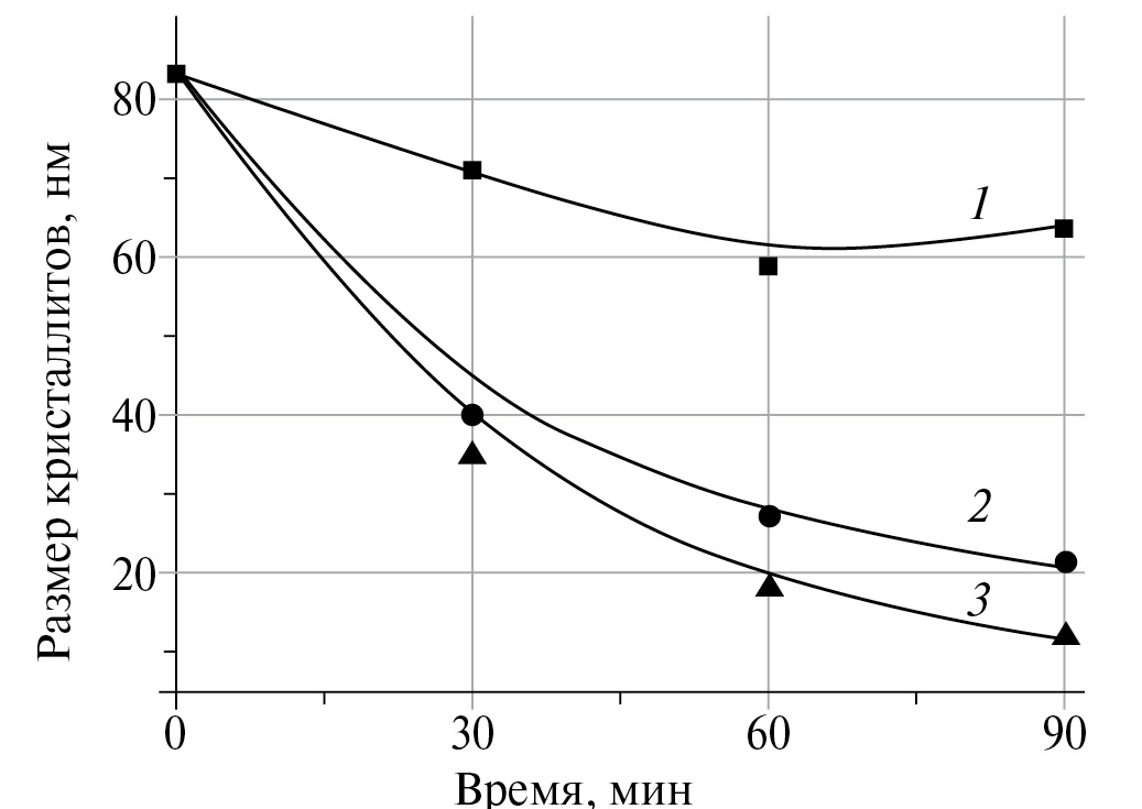 По мере увеличения подводимой энергии к материалу смеси происходит уменьшение интенсивности рефлексов и их уширение. Размер кристаллитов сфена монотонно уменьшается, при этом на степень уменьшения размера оказывает влияние величина подведенной энергии, которая определяется скоростью вращения, временем измельчения и соотношением массы шаров к массе обрабатываемого материала.