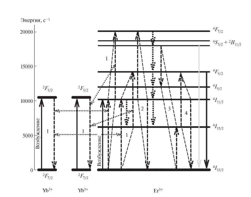 Наиболее эффективными механизмами заселения вышележащих электронных уровней 2H11/2 + 4S3/2 и 4F9/2 ионов Er3+ в исследуемых материалах могут быть нелинейные ап-конверсионные процессы 1 (рис. 4), в результате которых энергия двух возбужденных ионов Yb3+ передается одному иону Er3+, находящемуся в основном состоянии 4I15/2, и процесс 2, в результате которого два иона Er3+ в возбужденном состоянии 4I11/2 разменивают свою энергию, в результате чего один из них переходит в вышележащее состояние 4F7/2 [21]. При этом в результате конкурирующего безызлучательного механизма кросс-релаксации 3 (рис. 4) происходит эффективная разгрузка состояний 2H11/2 + 4S3/2. Электронный уровень 4F9/2 может эффективно заселяться за счет как спонтанного распада ионов Er3+ с уровней 2H11/2 + 4S3/2, так и нелинейного ап-конверсионного взаимодействия 4 (рис. 4) [21].