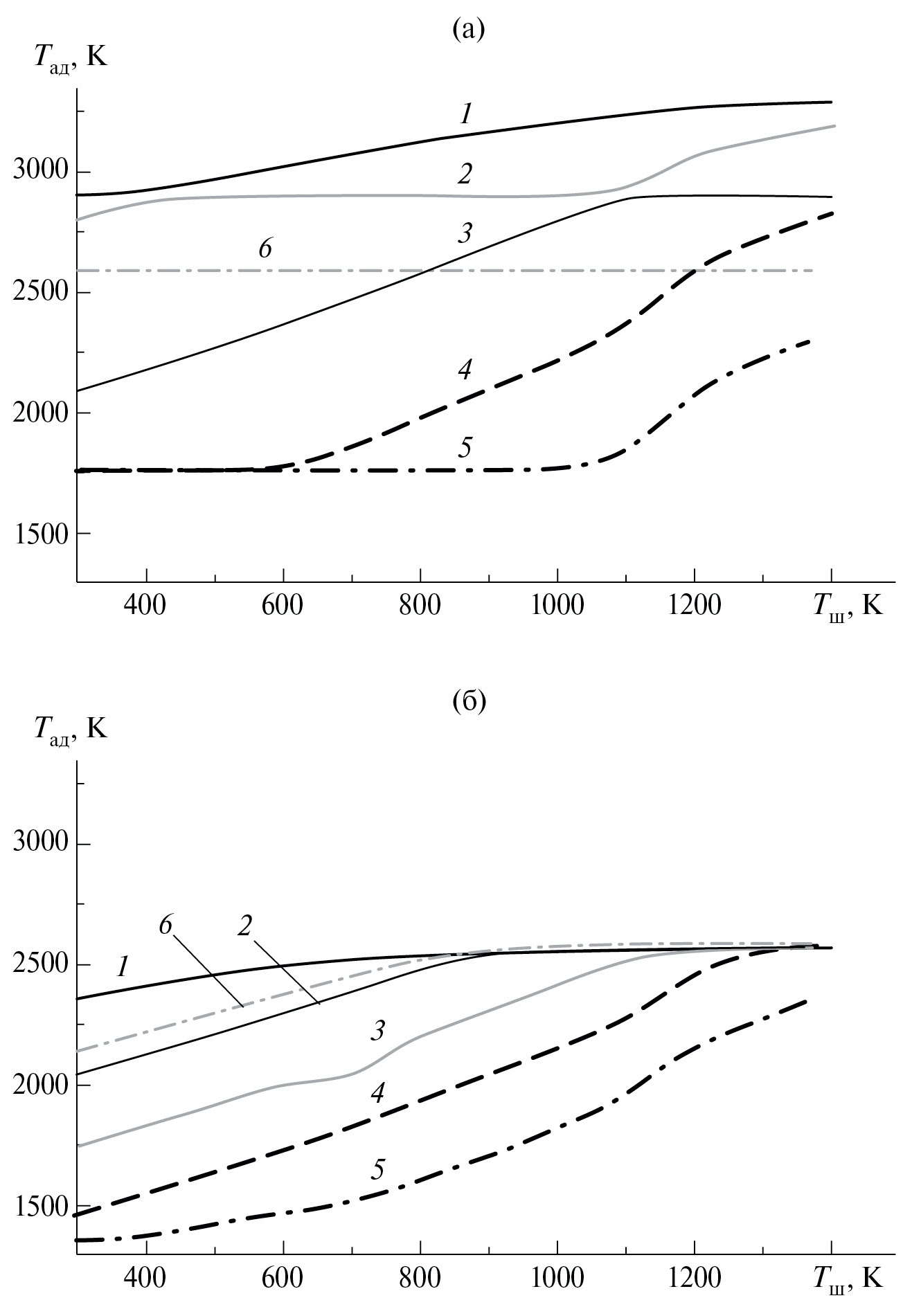 Рис. 1. Зависимости адиабатической температуры восстановления от температуры шихты в системах Ta2O5–M (а) и Mg4Ta2O9–M (б); M – Ca (1–5), Mg (6); содержание восстановителя: стехиометрическое (1, 6), избыток 25 (2), 50 (3), 75 (4), 100% (5).