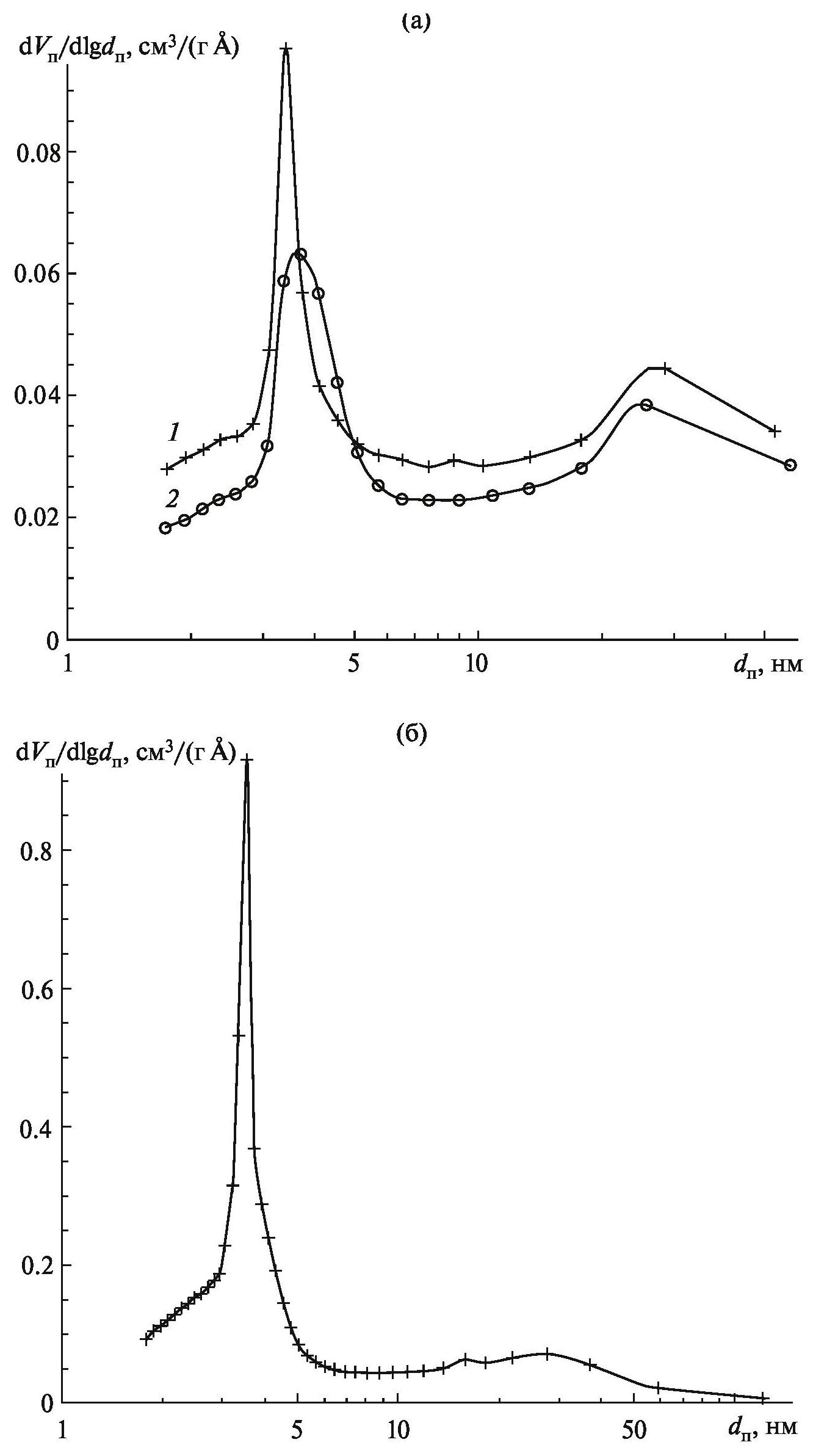 Рис. 4. Распределение пор по размерам в порошках ниобия, полученных восстановлением Mg4Nb2O9 парами кальция (а) и магния (б); удельная поверхность порошков: 42 (1), 32 м2/г (2) [40] (а), 154 м2/г (б).