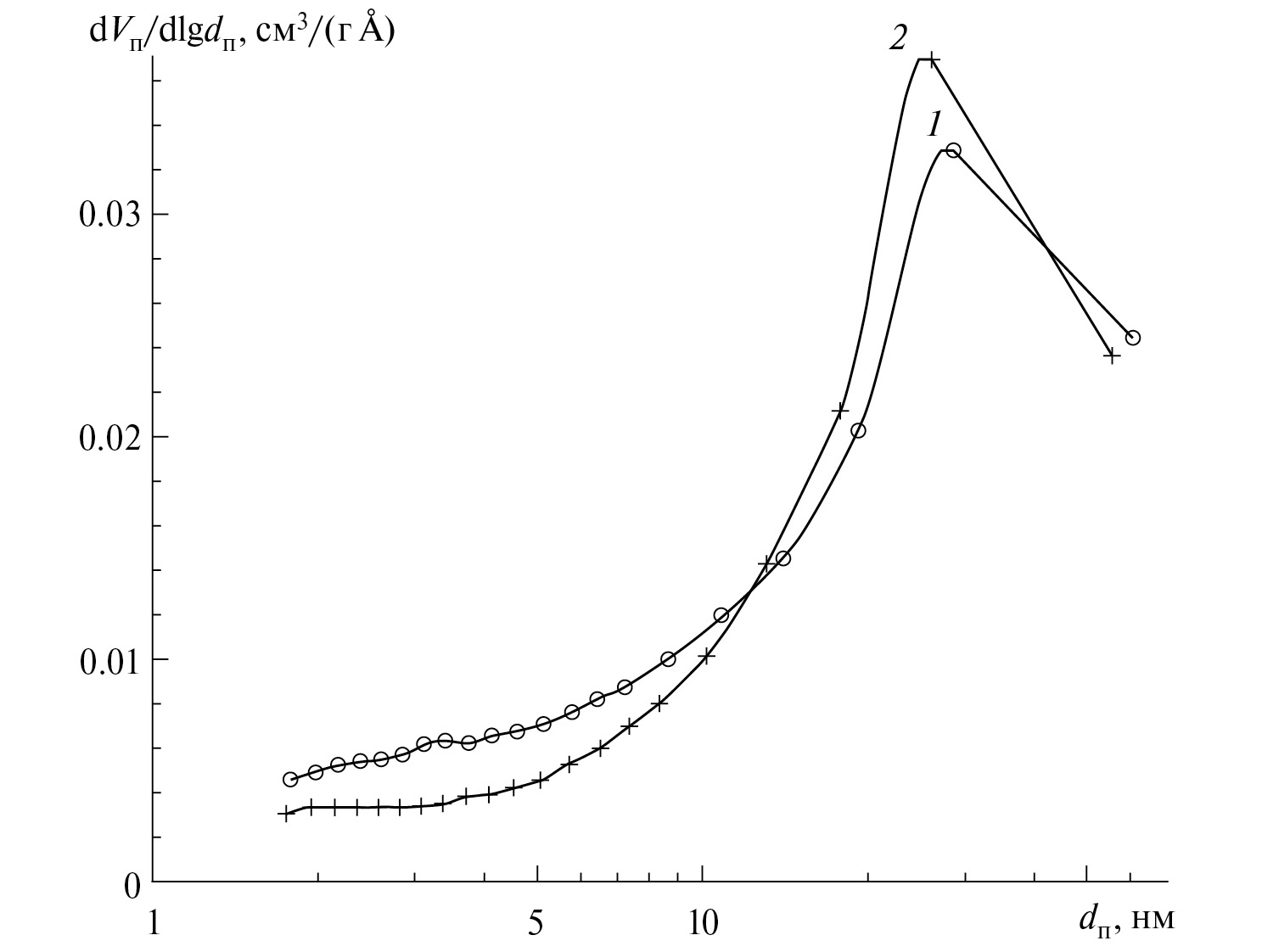 Рис. 3. Распределение пор по размерам в порошках ниобия, полученных восстановлением Nb2O5 парами кальция (1) [40] и магния (2); удельная поверхность порошков: 9.4 (1), 30 м2/г (2).