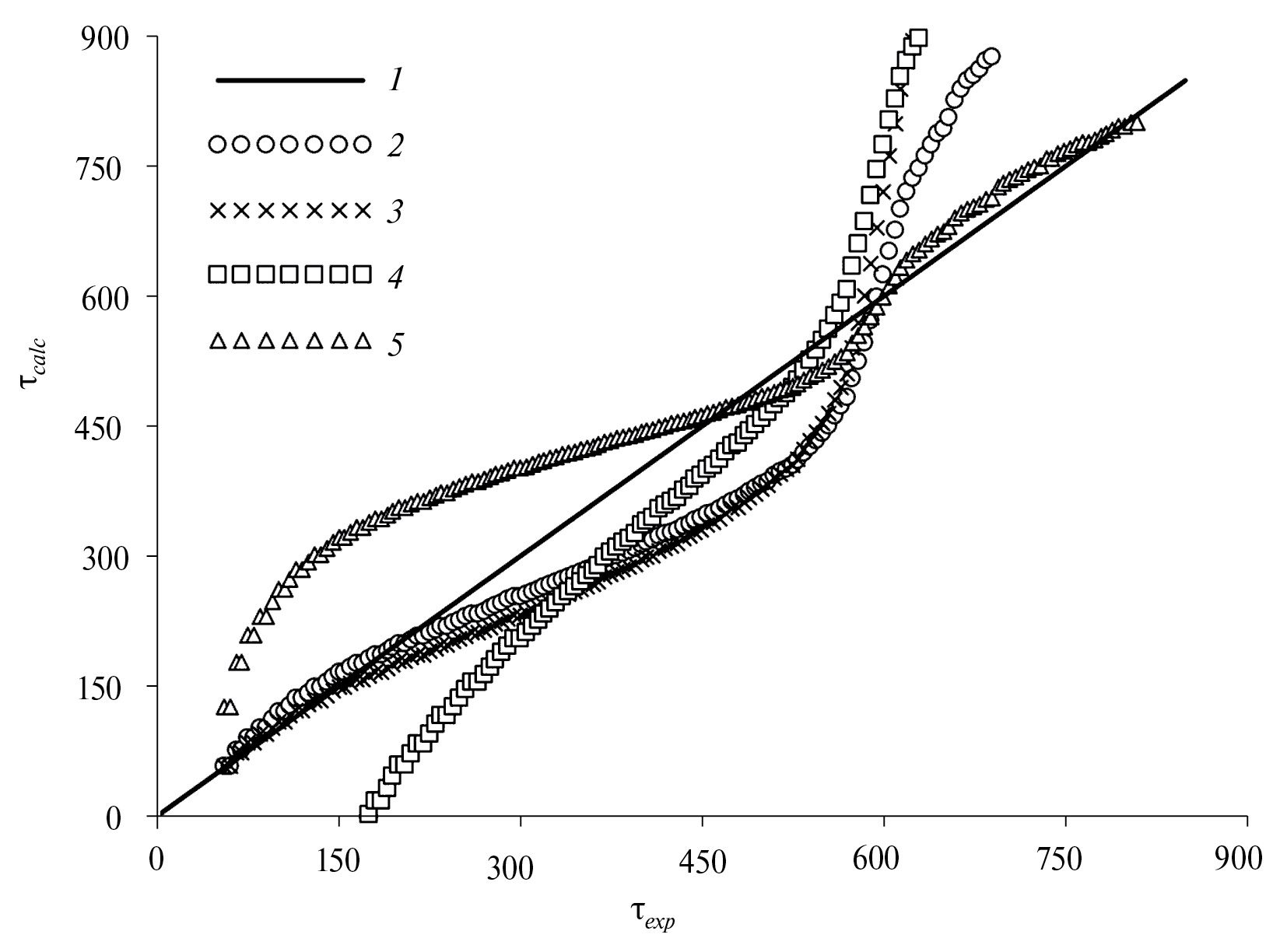 Используя параметры, приведенные в табл. 2, построены диаграммы, отражающие соответствие рассчитанного времени (τcalc) значениям из эксперимента (τexp) (рис. 3), и кинетические кривые гидратации β-CS̅H0.5 (рис. 4), полученные из уравнений (2), (5), (6) и (10).