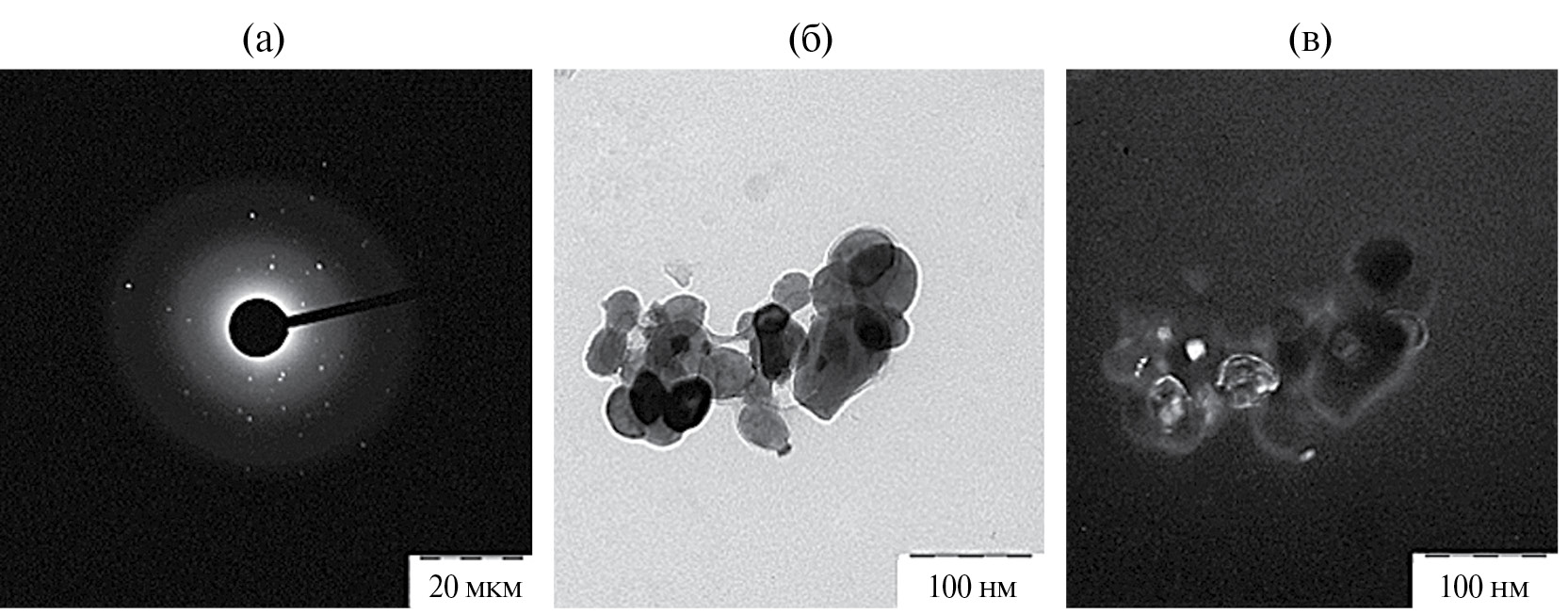 Анализ картин микродифракции и темнопольного изображения (рис. 3) полученных образцов подтверждает результаты РФА и указывает на их высокую кристалличность. Наличие мелких четких рефлексов и гало на картине микродифракции свидетельствует о том, что объекты являются нанокристаллическими.