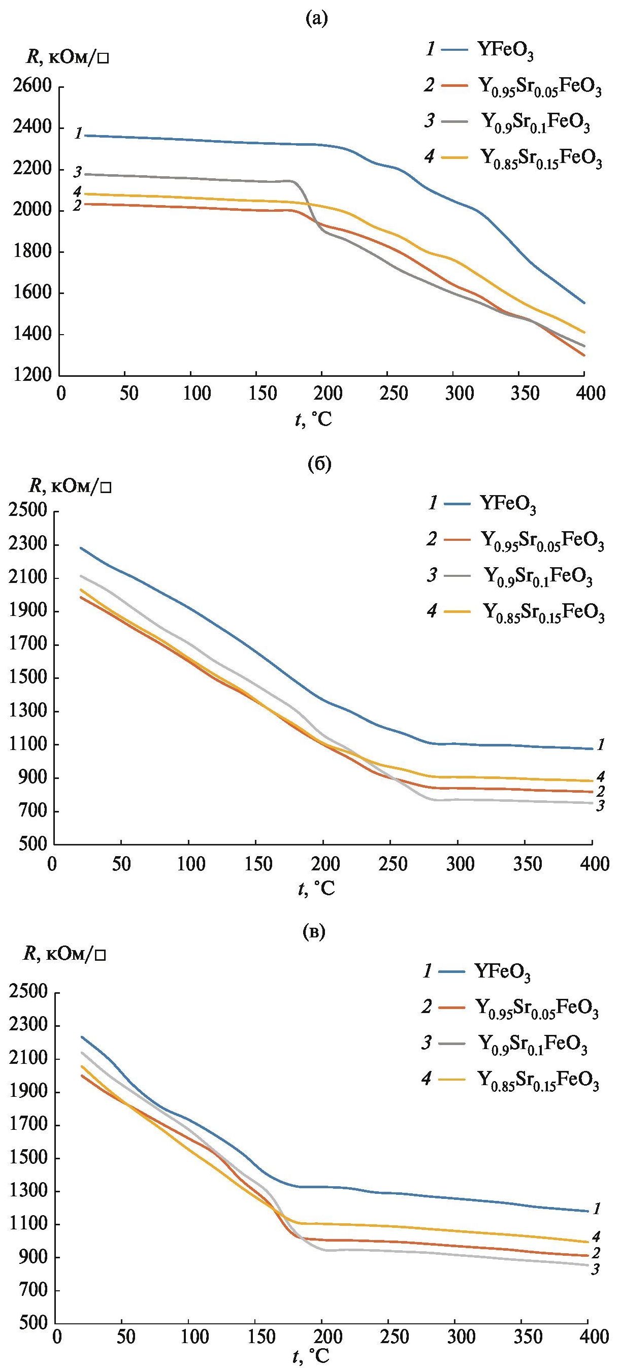 Рис. 4. Удельное поверхностное сопротивление полученных нанопорошков на воздухе (а), в присутствии NH3 (50 ppm) (б), СО (50 ppm) (в).