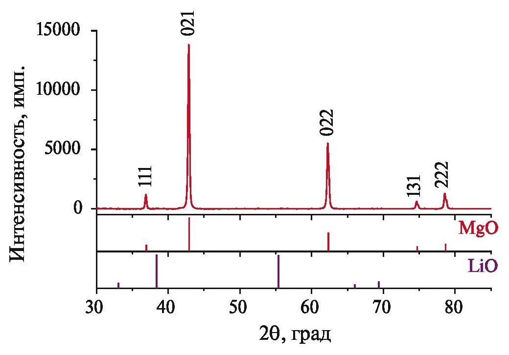 Структурные исследования керамик MgO. На рис. 5 приведена дифрактограмма измельченного в порошок образца керамики MgO, полученной из прекурсора с 1 мас.% спекающей добавки LiF. В процессе горячего прессования спекающая добавка не испаряется полностью, и на дифрактограммах обнаруживаются следовые количества фторида лития и гидроксида лития. Как будет показано ниже, наличие примесей в керамике обнаруживается также по зависимостям теплопроводности от температуры.