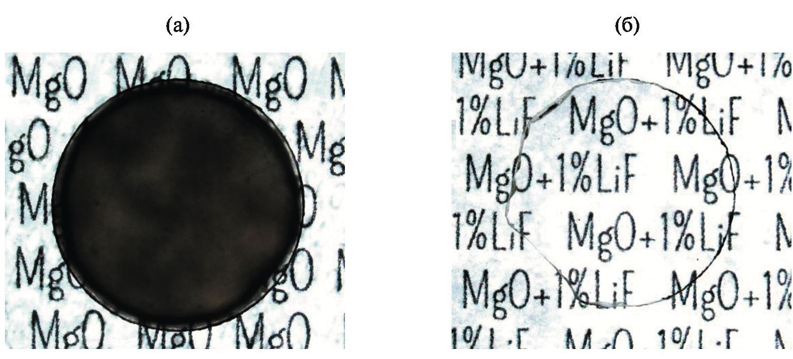 Рис. 7. Фотографии образцов керамики MgO, полученных без использования спекающей добавки (a) и с добавкой 1 мас.% LiF (б).