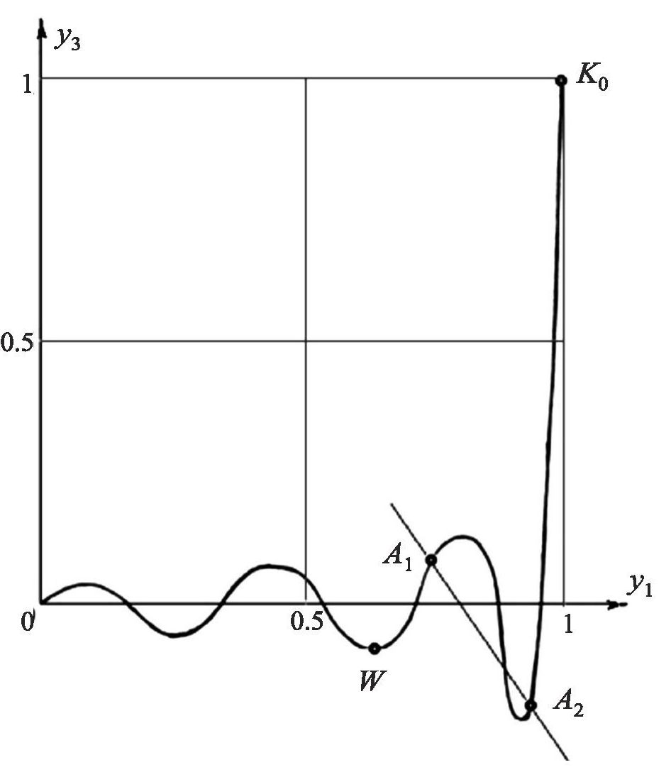 Линию (2.7) назовем контрольной кривой. Ее форма зависит от сочетания значений , , но всегда линия начинается в точке при и проходит через точку при (если ). Ее актуальный участок завершается в точке W с параметром и содержит точки , , расположенные последовательно соответственно значениям их параметров (2.3). В смещенном времени можно следить за движением по контрольной кривой изображающей точки, которая дважды пройдет дугу (из конца W в начало и обратно). При этом определитель будет каждый раз менять знак при прохождении через пункты , т.е. в точках пересечения контрольной кривой с гиперплоскостью . Геометрический смысл необходимого условия оптимальности заключается в том, что контрольная кривая не должна иметь с гиперплоскостью других точек пересечения, кроме тех, чьим параметрам , соответствуют запланированные моменты переключений.