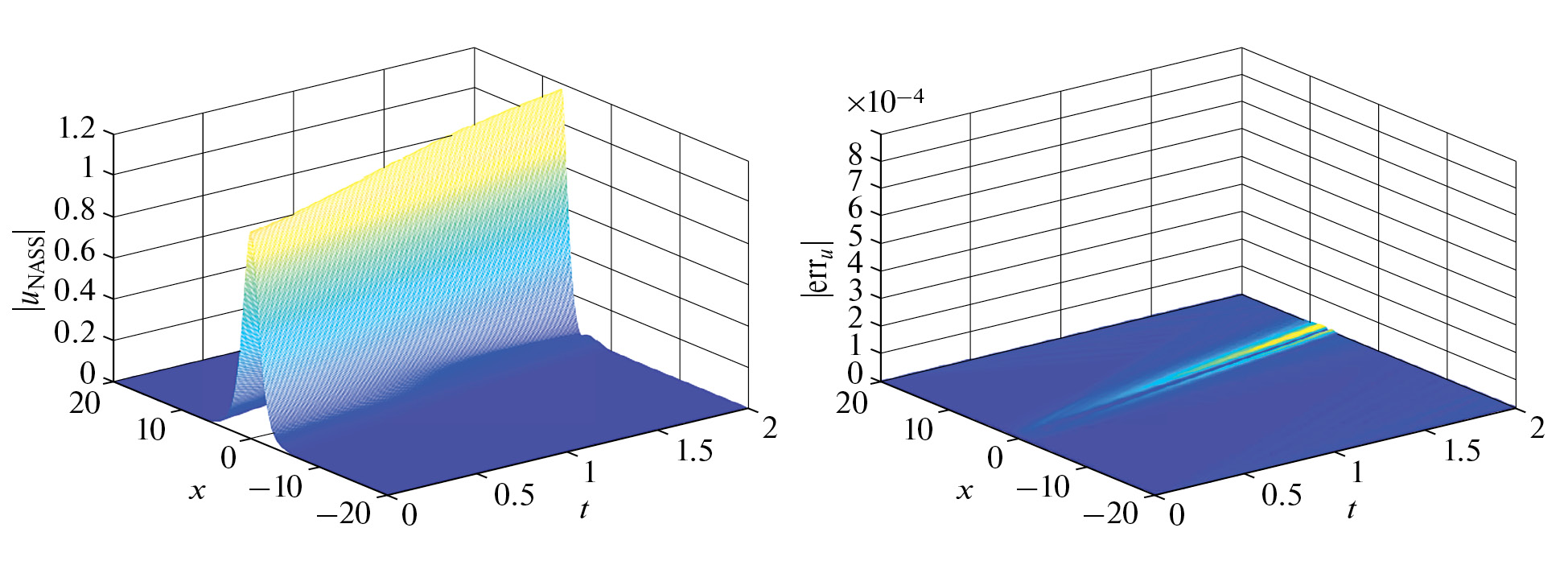 Рис. 16. Численные решения (слева) и их ошибки (справа) дробно-пространственных уравнений CNLS (5.3) при α = 1.9, M = 800, N = 600
