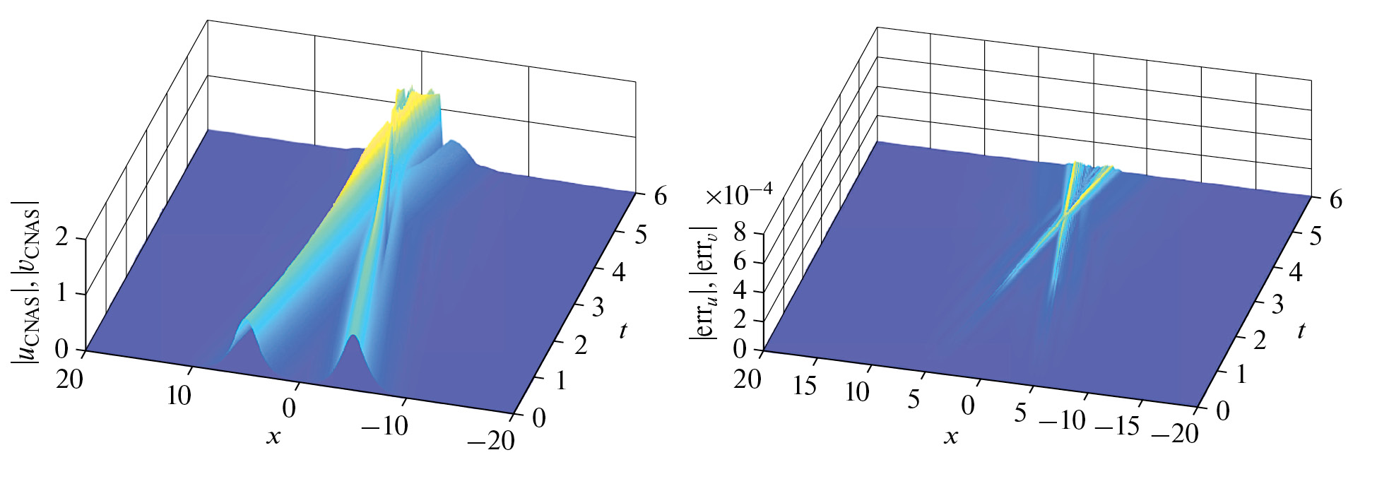 Рис. 17. Численные решения (слева) и их ошибки (справа) дробно-пространственных уравнений CNLS (5.3) при α = 2, M = 800, N = 600