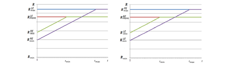 На рис. 8 приведены временные графики изменения тяги разнотяговых ТРДД силовой установки самолета в зависимости от границ диапазонов распределения значений таких косвенных параметров тяги, как частоты вращения РНД и РВД. Эти графики построены при экспериментальном моделировании алгоритмов управления частотами вращения роторов левого ТРДД с уровнем тяги RLE и правого ТРДД с уровнем тяги RRE с целью обеспечения балансировки их тяги в полете на основе разработанной модели в случаях Rmin≤RLE>RRE≤Rmax и Rmin≤RLE<RRE≤Rmax при минимально допустимом уровне тяги Rmin и максимально достижимом уровне тяги Rmax. На этих графиках использованы следующие условные обозначения: и – максимальный и минимальный уровни тяги левого ТРДД, значения частот вращения роторов которого находятся в заданных диапазонах случайного распределения значений частот по нормальному закону; и – максимальный и минимальный уровни тяги правого ТРДД, значения частот вращения роторов которого находятся в заданных диапазонах случайного распределения значений частот по нормальному закону; и – максимальный и минимальный уровни тяги левого ТРДД, значения частот вращения роторов которого находятся во вдвое суженных диапазонах случайного распределения значений частот по нормальному закону; и – максимальный и минимальный уровни тяги правого ТРДД, значения частот вращения роторов которого находятся во вдвое суженных диапазонах случайного распределения значений частот по нормальному закону.