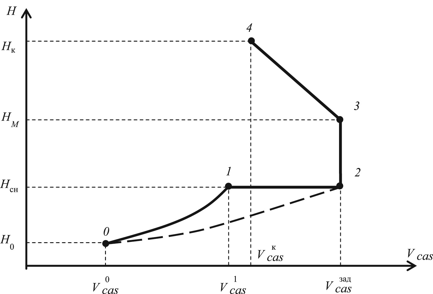 Здесь цифрами 0–4 обозначены характерные точки высотно-скоростного профиля полета: 4, 0 – начальная и конечная точки этапа; 3 – точка перехода с режима полета по числу Маха M = Mзад на режим полета со скоростью 2 – точка перехода на участок горизонтального полета; 1 – точка достижения заданной скорости . Пунктиром показан вариант без горизонтального участка полета.