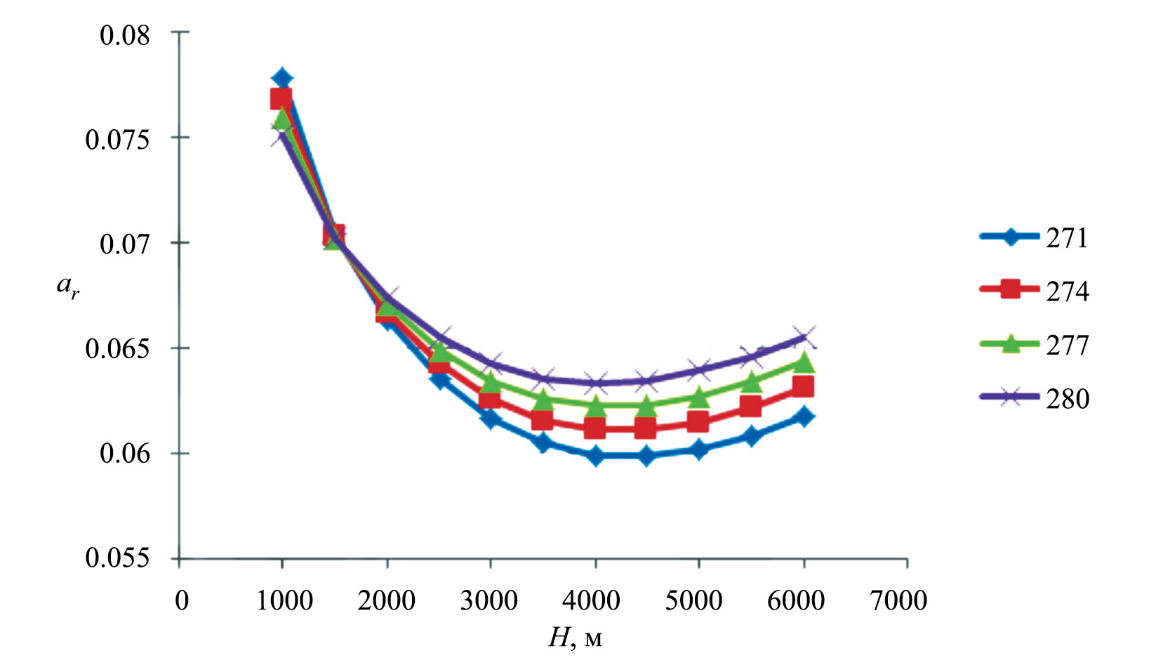 Далее рассмотрим два способа решения уравнения (7.3) при выполнении условия (8.2). В первом из них в качестве множества P0 выберем параметры Hсн, ar, а параметр будем использовать для оптимизации критерия стоимости. В этом случае соотношение (7.3) в области переменных Hсн, ar определяет некоторую линию F(Hсн, ar) = 0, в каждой точке которой выполняются условия по заданному времени прибытия. Линии F(Hсн, ar) = 0 для значений = 271–280kt показаны на рис. 4.