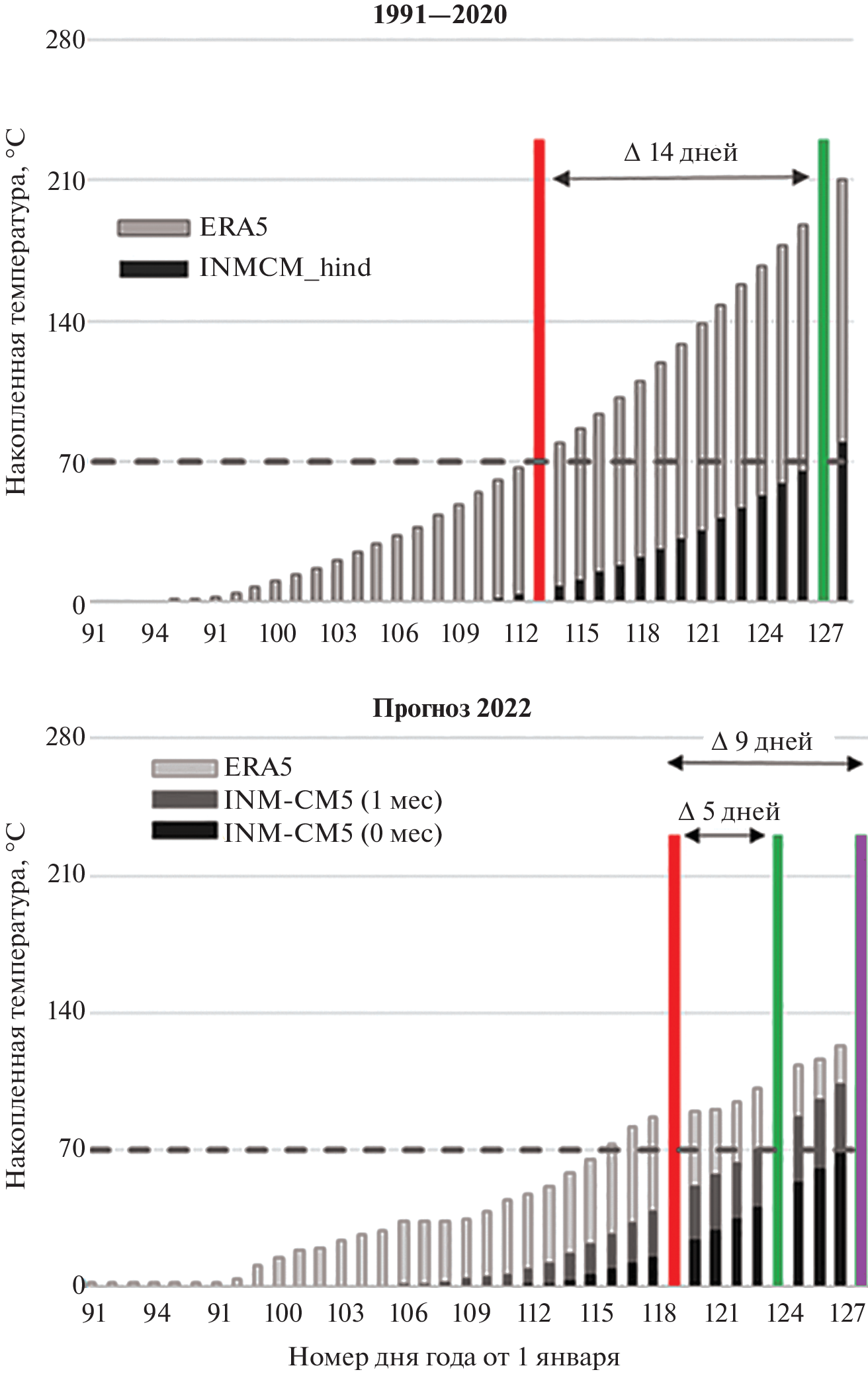 The experimental seasonal forecasts of the INM-CM5 climate model were used as input data for the temperature-time phenological model of birch dusting. Within the framework of the joint model, a test technology was developed for seasonal forecasting of the timing of the beginning of birch dusting in the European territory of Russia. Verification of this technology on seasonal retrospective forecasts of the INM-CM5 model (1991–2019) showed an adequate reproduction of the birch dusting start dates calculated for the same period according to the ERA5 reanalysis. The mean systematic errors are ±2 days, and the spatial correlation coefficients are above +0.84. The forecasts of the date of dusting start in 2022, calculated from the experimental operational seasonal forecasts of the INM-CM5 model with a monthly lead-time and with a zero lead-time, are also evaluated. It is shown that the errors in forecasting the beginning of dusting are ±5–10 days, and the forecasts with a one-month lead-time have fewer errors. The obtained results allow us to conclude that the seasonal forecast of the surface temperature of the INM-CM5 model can be used as input information for the temperature-time phenological model for the operational forecast of the timing of the start of birch dusting in the European territory of Russia.
