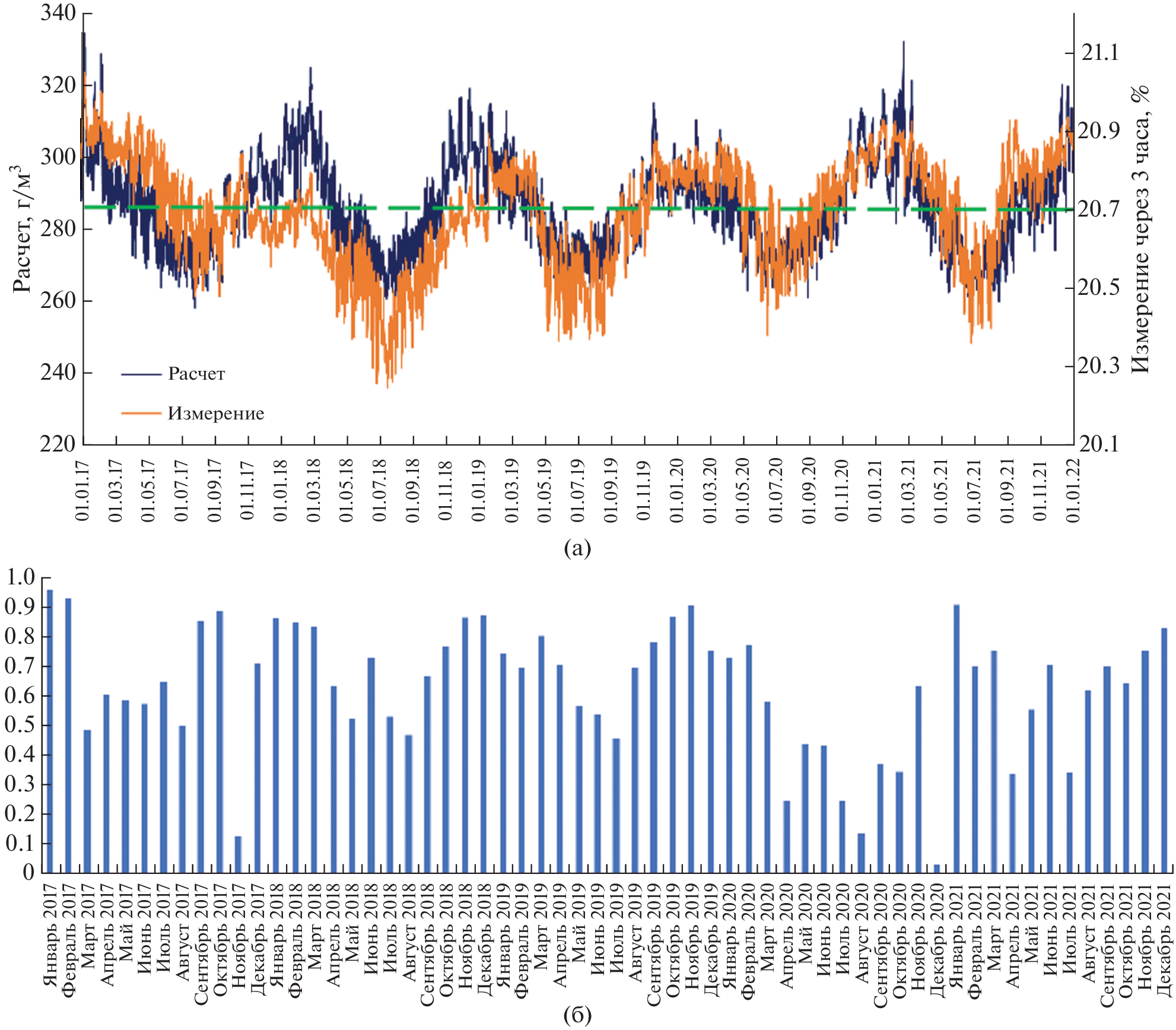 The article analyzes the results of measuring the oxygen content in Moscow in 2017–2021 at three automatic stations for monitoring atmospheric pollution of the “Mosecomonitoring”. Seasonal variations of oxygen content in the city are considered, the issues of compliance of the obtained values with the scale of comfort level for human breathing developed by medical specialists are discussed, measurement data are compared with the results of calculating the oxygen concentration in the air by the magnitude of meteorological parameters. According to the measurements, diurnal variations of the O2 content in the surface urban air, more pronounced in the warm season, were revealed. The minimum O2 content is observed in summer in the early morning hours. The main natural and anthropogenic processes that determine the variability of oxygen content in the surface air of a megalopolis at different time scales are discussed.