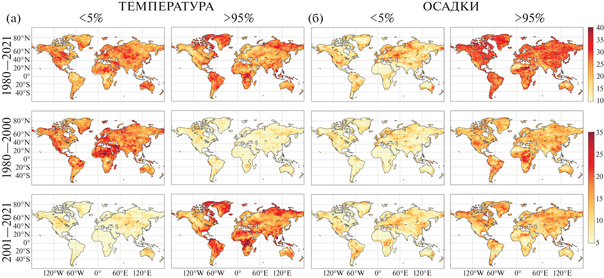 Global temperature rise on the planet is accompanied by an increase in the frequency of extreme weather events, which can lead to significant disturbances in plant metabolic processes and the functioning of plant communities. Depending on the type of vegetation and climatic conditions, the extent and nature of this impact can vary significantly. Therefore, the aim of this work was to identify areas with different types of plant communities that have been most affected by extreme temperatures and precipitation in recent decades. To identify regions with temperature and precipitation extremes, we estimated the frequency of exceeding a given threshold (less than 5% quantile or greater than 95% quantile) for selected theoretical probability density functions for the air temperature and precipitation series. The number of cases of exceeding the extreme threshold is calculated for the whole globe, their spatial and temporal variability in different seasons of the year and in the first decades of the XXI century compared to the end of the XX century is analysed. The regions with different types of plant communities with the most pronounced amplification of extreme temperature and precipitation regimes under changing climate conditions were identified.