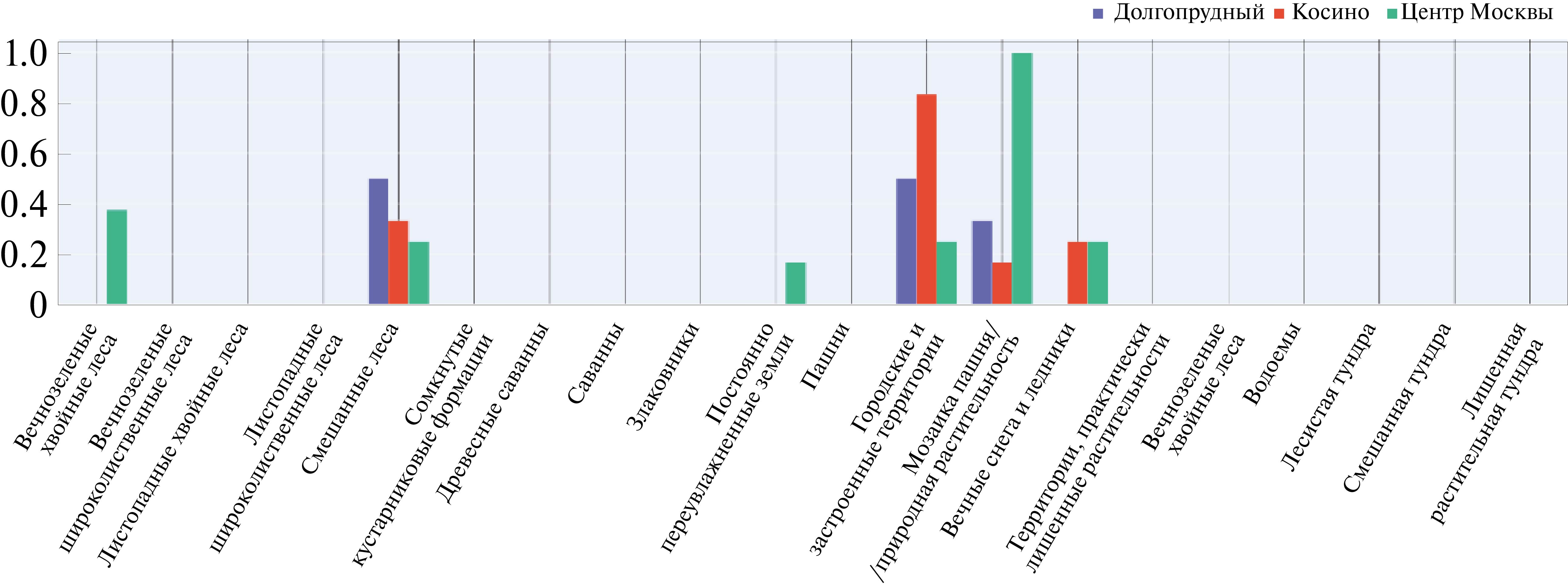 Рис. 1. Распределение долей площадей классов подстилающей поверхности в области чувствительности двух приборов МТР-5 (Долгопрудный и Косино) и квадрата вокруг центра Москвы со стороной 20 км (центр Москвы).