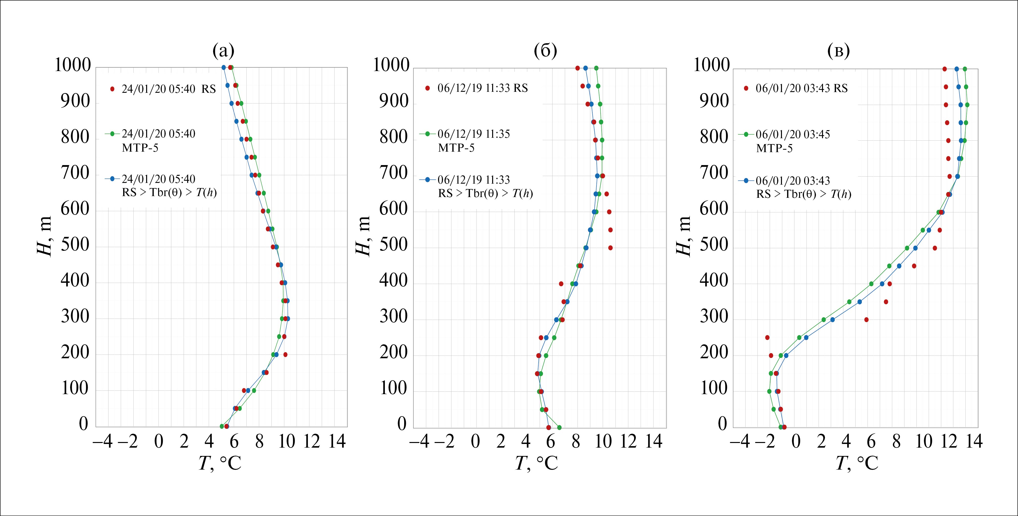 На рис. 3 показан пример сравнений измеренных профилей МТР-5 (зеленая линия) с данными измерений радиозондов (RS-красные точки) во время проекта SOFOG3D зимой 2019–2020 г. в Бордо (Франция) [Martinet et al., 2022]. Голубая линия на графиках – это профили T(h), восстановленные из яркостных температур радиозонда Tbr(Ө), которые получены решением прямой задачи, а именно расчетом распределения Tbr(Ө) из профиля температур радиозонда Т(h). Графики иллюстрируют качество метода восстановления и величину аппаратной ошибки. Представлены профили для случаев инверсий различного типа. На рис. 3а показан случай с приземной G-инверсией. Рисунок 3б – приподнятая E-инверсия. Рисунок 3в – высоко приподнятая инверсия НЕ, когда нижняя граница инверсии на высоте выше 250 м.