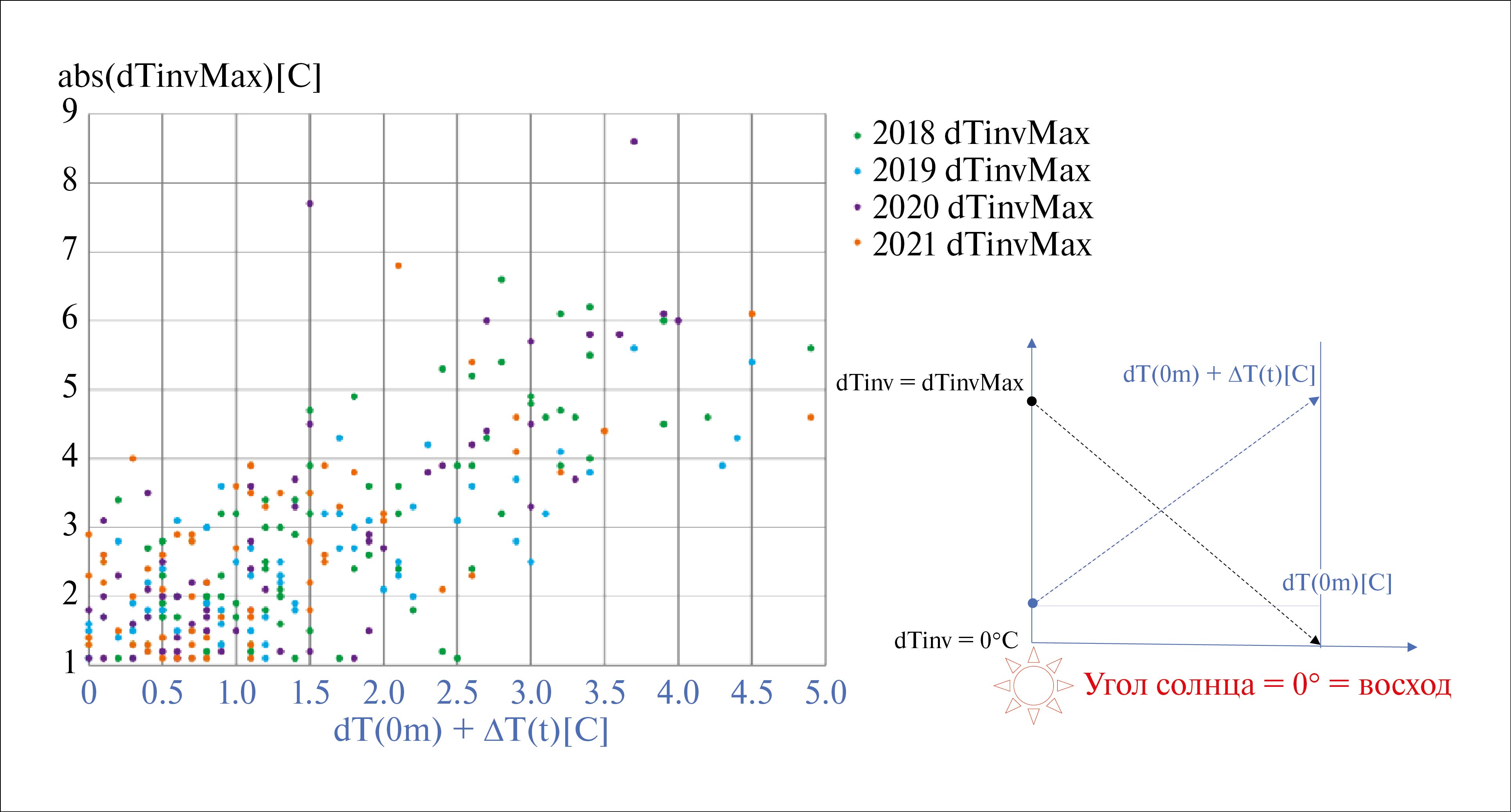 Учет угла Солнца как косвенная оценка степени дневного прогрева ППС помогает оценить сроки перестроения динамики температурных инверсий и получить качественные оценки сезонно-зависимых распределений характеристик температурного режима для данного места наблюдений. На рис. 10 показана зависимость срока разрушения инверсии с мощностью dT на момент восхода Солнца от степени прогрева (dT(0 м) + dT(t)) слоя толщиной примерно 30 м на расстоянии 1 км (измерения МТР-5 SN050 с уровня горизонт), т. е. показано, насколько надо прогреть слой толщиной несколько десятков метров от земли для разрушения зарегистрированной на момент восхода Солнца инверсии мощностью dTinv(С). По результатам наблюдений видно, что для разрушения инверсии мощностью больше 4 градусов требовался прогрев слоя у земли на более чем 1.5o.