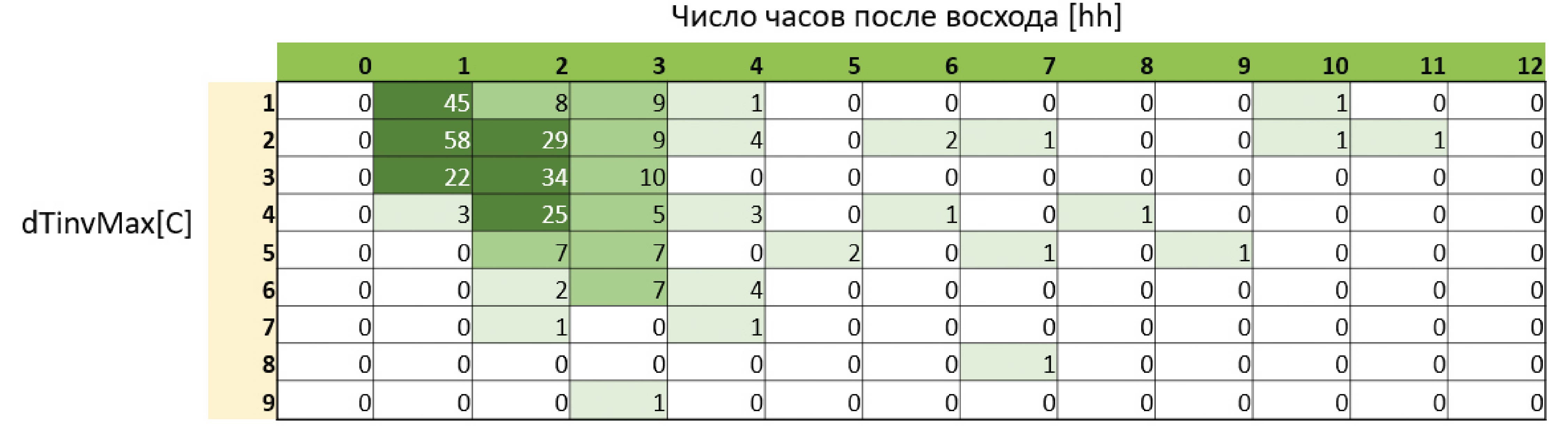 В табл. 1 и 2 представлено распределение сроков разрушения инверсии, мощность которой в момент восхода Солнца была dT через угловое положение Солнца (табл. 1) и от срока времени (табл. 2), прошедшего с момента восхода, рассчитанные по среднечасовым профилям температуры. Расчеты производились по результатам измерений с 2018 по 2021 гг. Мощность по температуре округлена до целого значения.