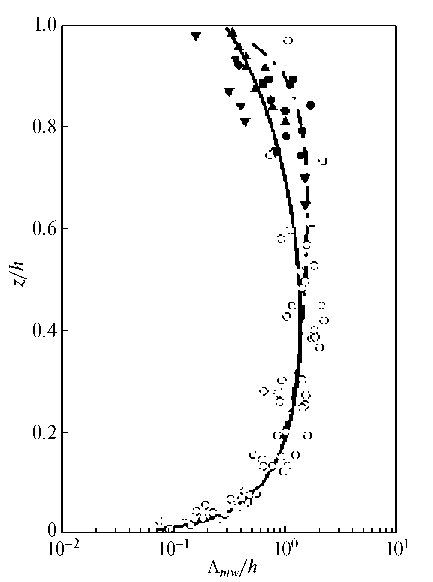 Рис. 3. Изменение с высотой безразмерной длины волны Ʌmw/h. Сплошная линия соответствует аппроксимации при значении коэффициента βP = 1.2. Штрихпунктирная линия соответствует аппроксимации, предложенной [Caughey, Palmer, 1979]. Геометрические символы представляют натурные измерения [Caughey, Palmer, 1979]. Светлые кружки соответствуют данным эксперимента в Minnesota-1973. Черные кружки, треугольники и квадраты соответствуют данным эксперимента в Ashchurch-1974.