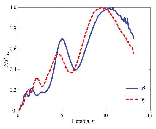 В большинстве случаев колебания интенсивности турбулентности в море очень четко коррелировали с . При умеренных и сильных ветрах масштабы периодичностей турбулентной энергии в приповерхностном слое были близки к масштабам изменчивости (рис. 3), в то время как связь с волнением прослеживается не так явно. Из этого следует вывод, в частности, о значительном влиянии тангенциального напряжения ветра на изменчивость морской турбулентности.