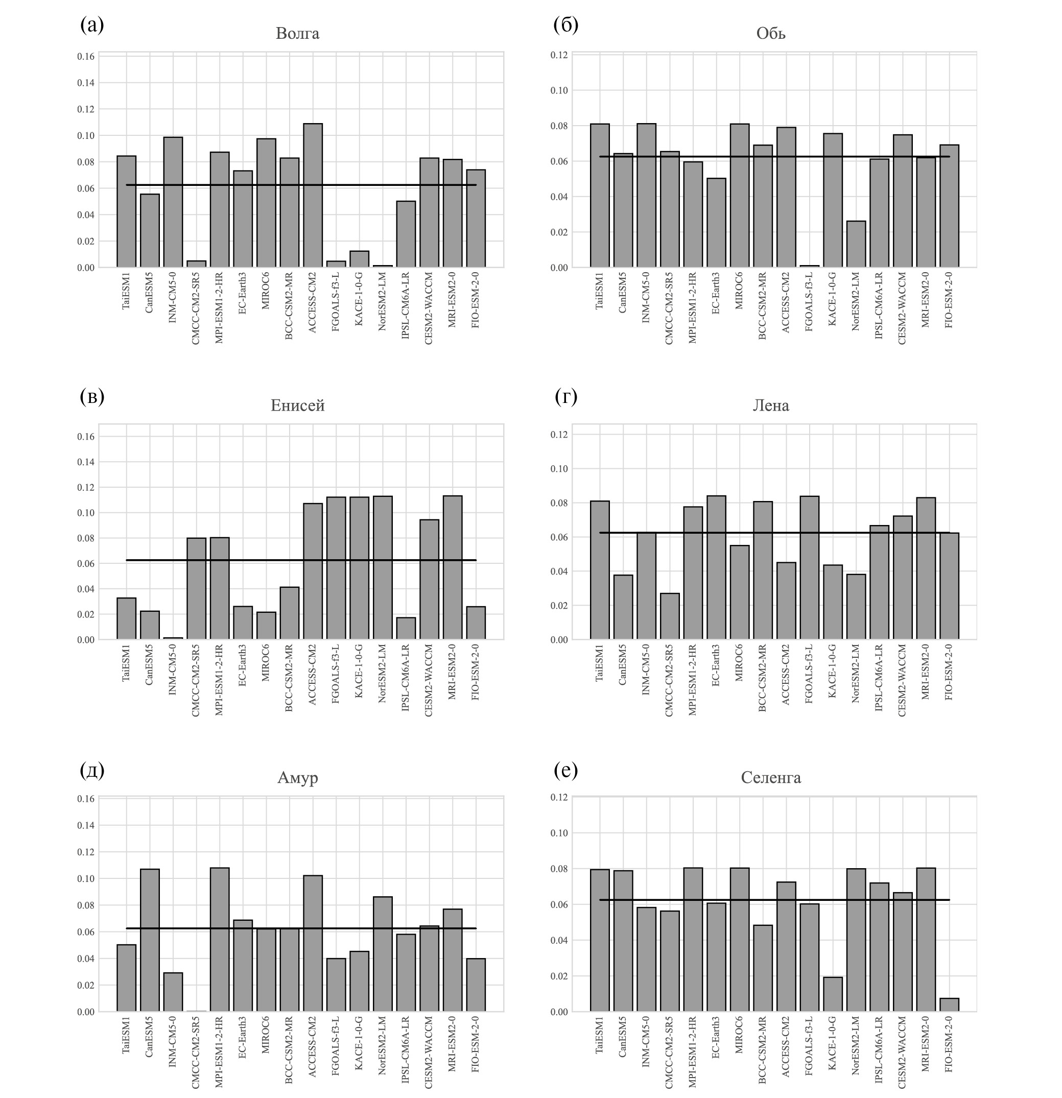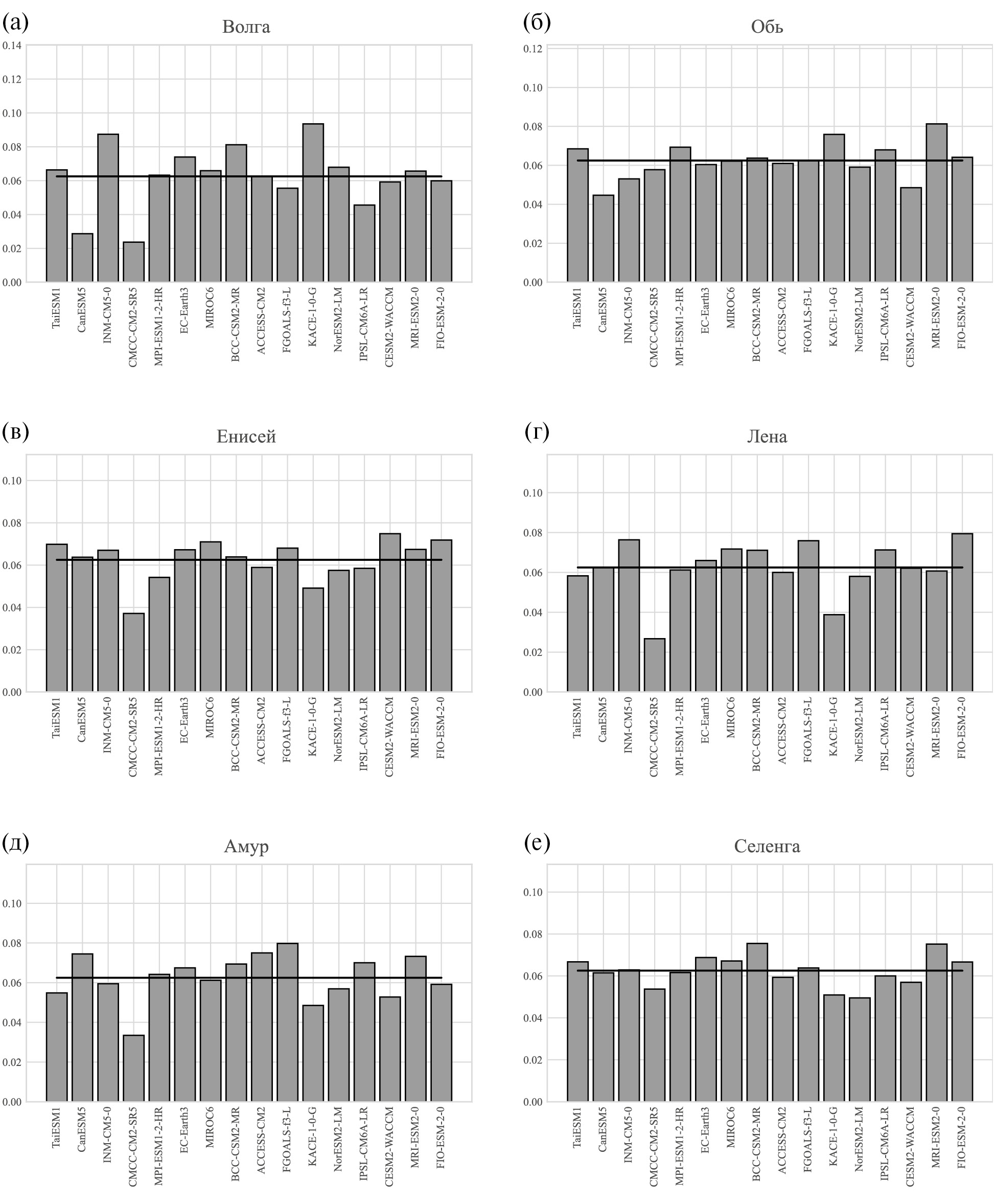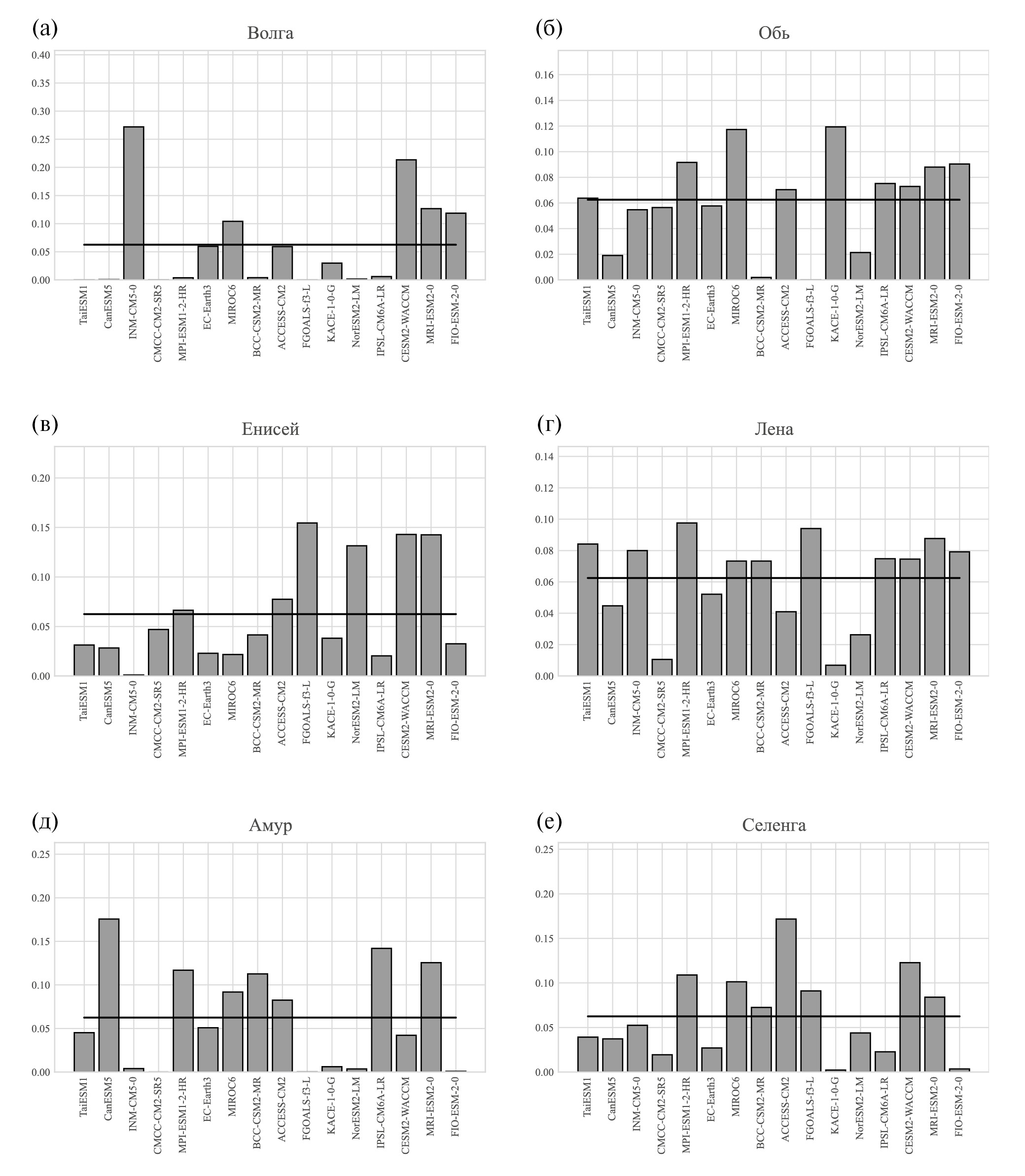 При анализе использовались результаты расчетов среднемесячных значений полного стока с моделями ансамбля CMIP6 (CMIP переменная mrro) при сценариях “historical”, SSP1-2.6, SSP2-4.5 и SSP5-8.5 [Gidden et al., 2019] (табл. 1). Они осреднялись по водосборам ряда рек — Амур, Лена, Обь, Енисей, Селенга, Волга, выделенных согласно [Graham et al., 1999] с разрешением по широте и долготе (рис. 1, табл. 2). Все эти водосборы достаточно велики для достаточного адекватного учета их в современных моделях Земной системы, типичное горизонтальное разрешение которых – порядка 102 км [Climate Change, 2021]. При наличии расчетов с разными начальными условиями для одной и той же модели анализировался только один из них (в архиве CMIP6 обозначенный как i1). Использование переменной полного стока обусловлено тем, что годовое стокообразование в бассейне должно точно совпадать при условии отсутствия значительного заполнения подземных резервуаров: фактор, который не учитывается в моделях. В качестве эталонных данных для стока были использованы данные сайта https://gmvo.skniivh.ru/index.php?id=1 о расходах воды, выбранных для анализа рек.