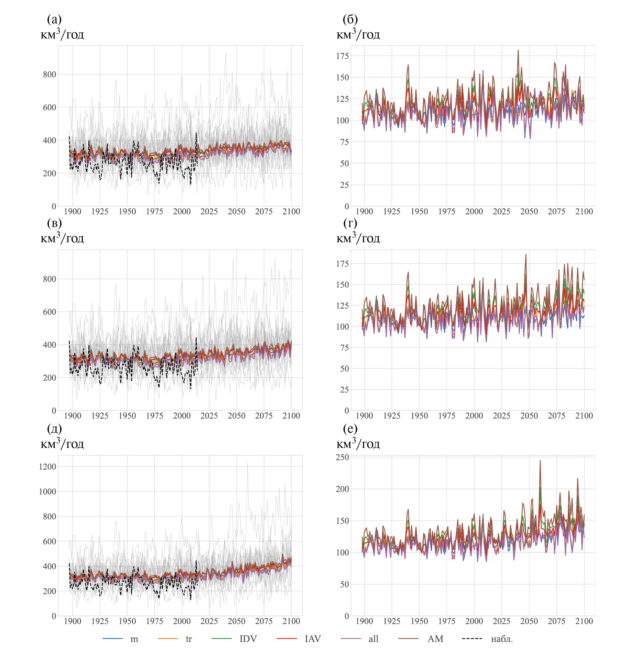 В XXI в. средний по ансамблю сток увеличивается для большинства анализируемых рек за исключением Волги. Это увеличение более выражено при сценариях с большими антропогенными воздействиями. Оно особенно значимо для сценария SSP5-8.5, при котором тренд увеличения стока в 2015–2100 гг. относительно его современного среднего многолетнего значения составляет % для Оби, % для Енисея, % для Лены, % для Амура и % для Селенги. Основной причиной изменения ансамблевого среднего стока в XXI в. в моделях при всех сценариях SSP является изменение осадков.